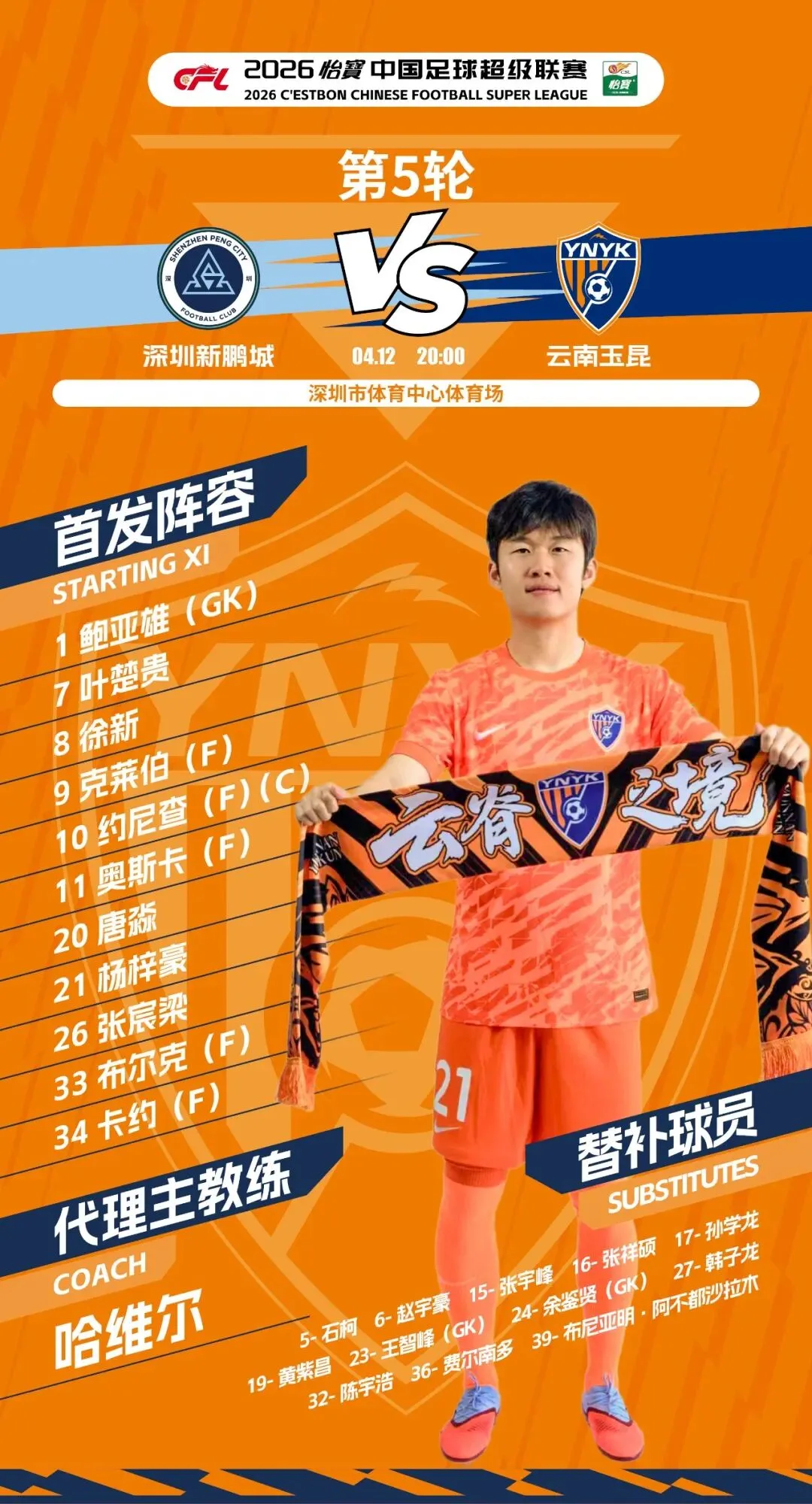 本场比赛,玉昆主帅乔迪遭遇停赛,由助理教练哈维尔现场指挥。玉昆依旧排出4-1-4-1的首发阵型,鲍亚雄首发镇守球门,杨梓豪、布尔克、张宸梁、唐淼搭档组成后防线,徐新担任单后腰,奥斯卡、卡约、约尼查、叶楚贵组成中场线,克莱伯突前担当首发前锋。