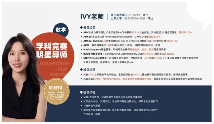 思客AMC竞赛培训师资&教研团队庞大,主讲老师大部分为海内外名校毕业,拥有多年国际竞赛教学经验。帮助学生精准备考,高效提分!(仅展示部分师资)