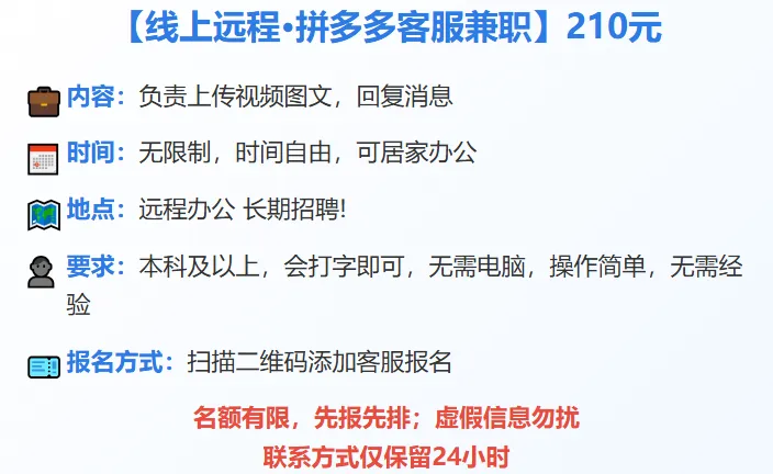 >【深圳兼职】日薪210元!拼多多客服兼职,负责上传视频图文,回复客户消息,时间自由,可居家办公.