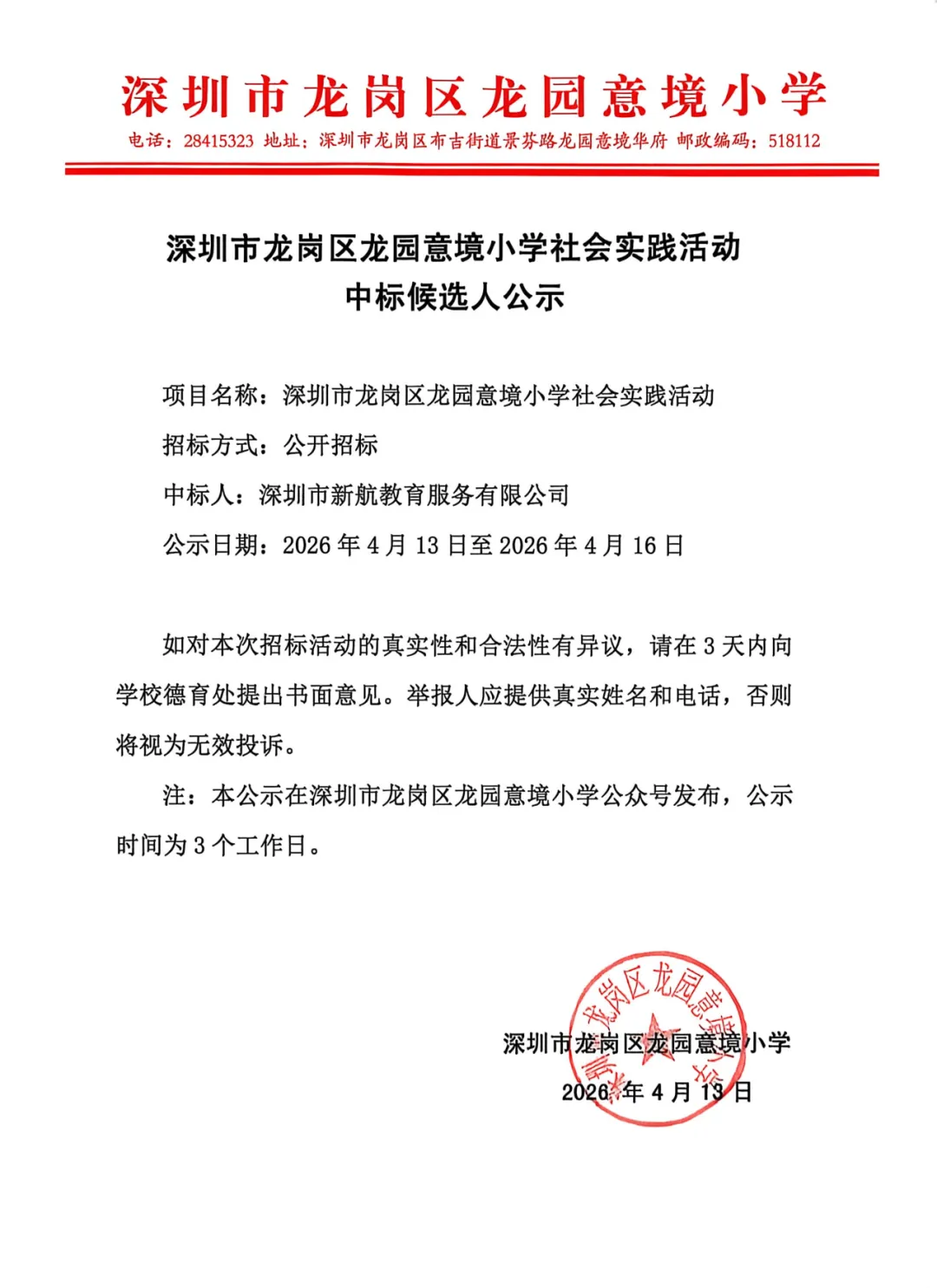 深圳市龙岗区龙园意境小学社会实践活动中标候选人公示