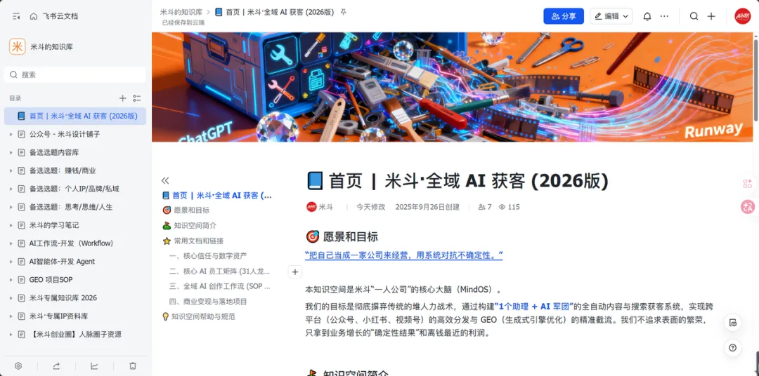 坦白讲,写这篇公众号的时候,我刚才用 AI 做完了今天的深度复盘日记。很多老板问我,到底什么是“把自己当成一家公司来经营”?本质上讲,就是用系统对抗不确定性。不要靠肉身去死磕,要靠工作流。给大家汇报一下,我最近刚刚跑通了【米斗 OS · 公众号全自动化工作流】。我现在的创作状态是:只需要在飞书写完这篇文档,丢进系统,点击一下运行,剩下的排版、配图、发布……全部由 AI 帮我自动跑完。我今天把我的“全域获客印钞机”底层架构毫无保留地公开:- 📂 基座: 飞书云文档(作为所有战略指令的指挥舱)