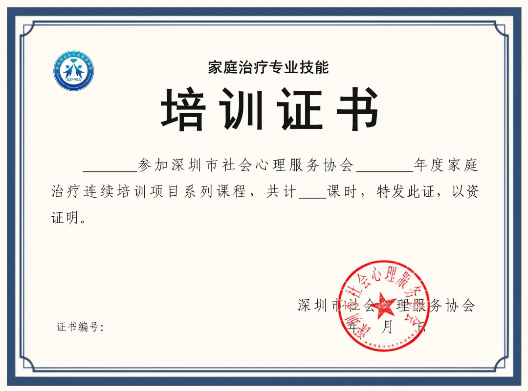 学员在完成学习内容并考核合格,符合条件的将由深圳市社会心理服务协会颁发:“深圳市社会心理服务协会家庭治疗连续培训证书”,证书可在协会官网查询。