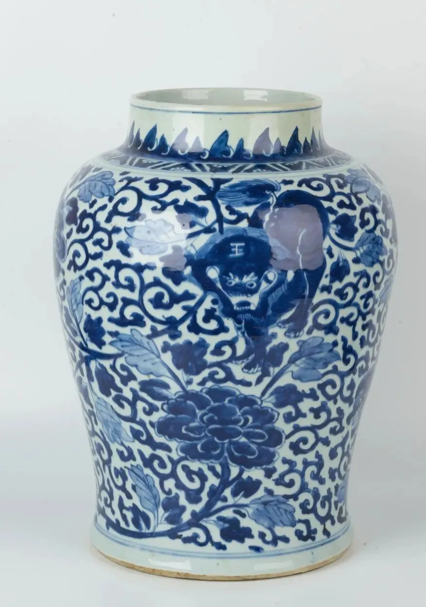本品为明晚期青花重器,器型取将军罐形制,直口短颈,丰肩收腹,圈足敦厚,整体气势雄浑饱满,胎体厚重,手感沉实,尽显晚明时期大件青花瓷器的雄浑气度。