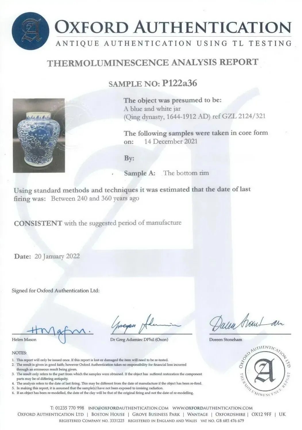 附牛津大学热释光断代报告:1644-1912 AD,距今240-360年