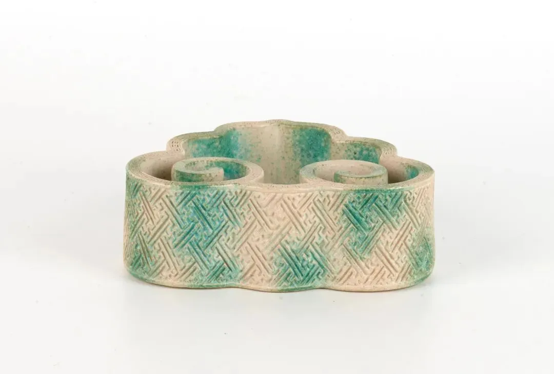 本品为清代道光时期文房雅器,整体呈如意云头形,器身两侧塑作卷云状,造型精巧别致,寓意“吉祥如意”。 通体施吹绿釉(翡翠釉),釉色青翠淡雅,如翡翠般温润,局部釉层自然晕散,与米白色胎骨相映成趣,层次丰富。