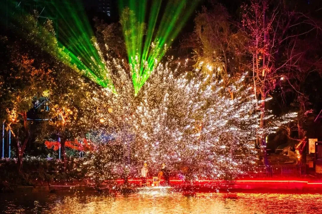在《锦绣盛市·梦华录》带火园区东区之后,西区的翠湖区域显得有些“安静”。锦绣中华没有忽略这个运营细节,反而借此机会,依托水域地形,打造了一台大型沉浸式水上实景非遗秀——《翠湖幻境》。主创团队思考的是:非遗怎么表达,才更符合当下的审美?他们选择了“水火光影+非遗技艺”的组合——百米水上长龙、火壶钢花,配上水爆、激光、巨型浮台等科技手段,把傩舞的神秘、侗族大歌的悠扬、空中威亚的惊险,融在一场360度的全景体验中。在这里,火壶钢花在水面上炸开的那一刻,年轻人会不由自主地举起手机,不是因为它“古老”,而是因为它“震撼”。