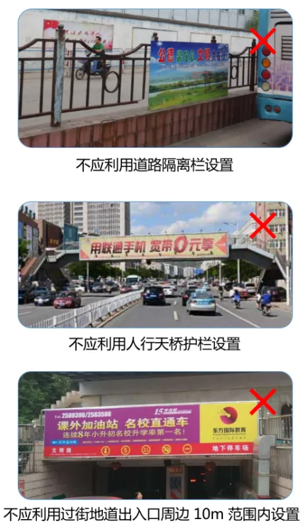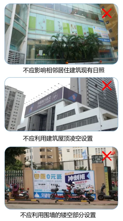 特定区域的设置要求:户外LED显示屏广告设施在直接面对住宅、医疗及宿舍等窗户时,严禁采用动态显示(缓慢切换刷屏时每帧停顿须≥10秒),且在机动车道和人行道两侧也不宜设置动态模式。