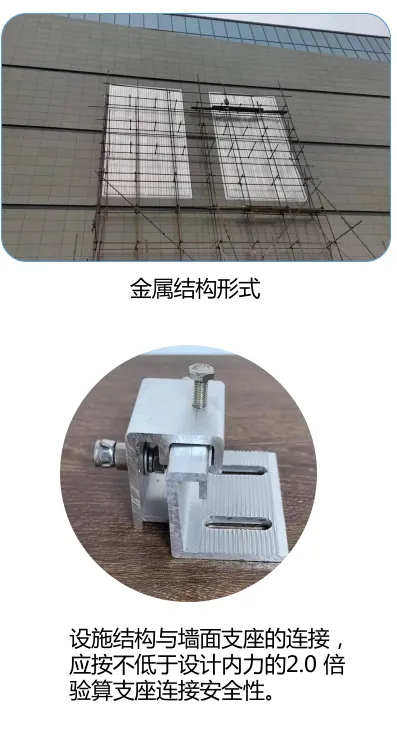 保障依附设施结构安全:依附建筑外墙的设施须确保原结构在附加荷载后仍满足安全指标,锚固支座应直接连接建筑结构件并承担荷载,且结构与墙面支座的连接安全性应按不低于设计内力2.0倍进行验算。
