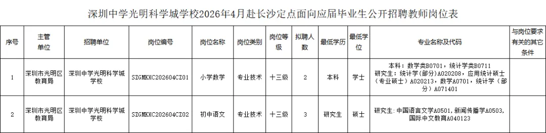 深圳中学光明科学城学校2026年4月赴长沙定点面向应届毕业生11名