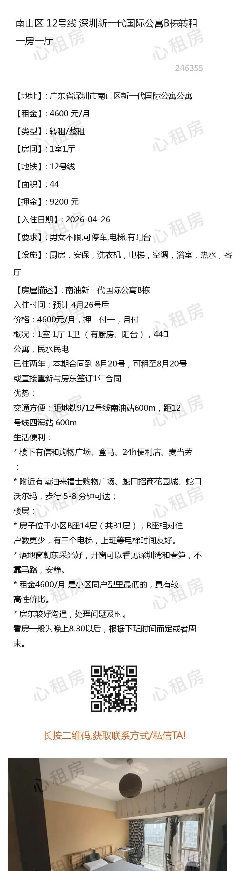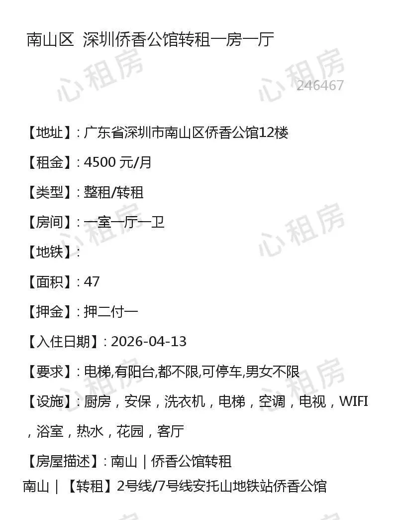 深圳租房【南山4则】房源①:12号线深圳南山转租一房一厅4600元/月;房源②:…