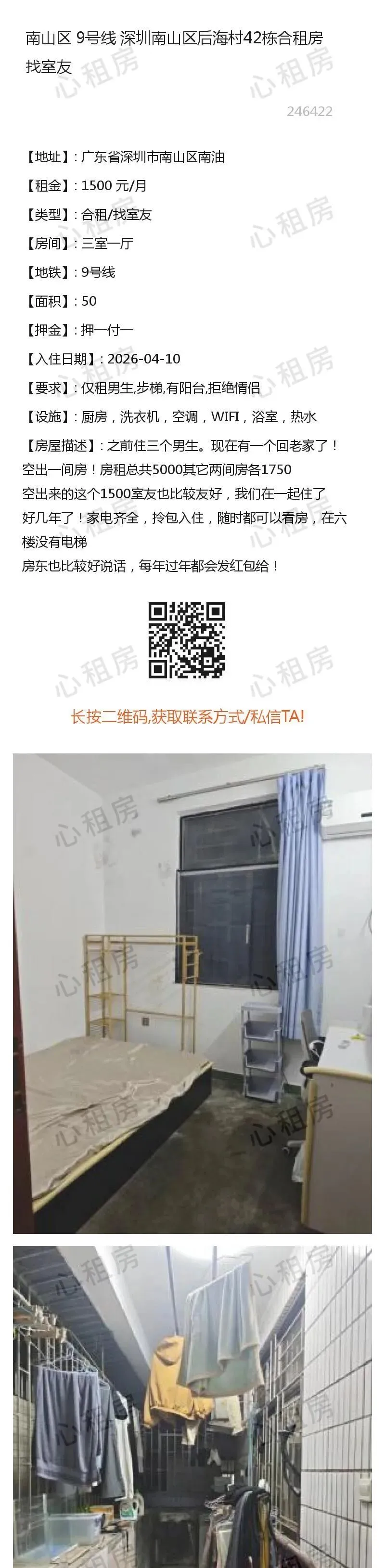 深圳租房>>南山区9号线深圳南山区后海村42栋合租房找室友1500元/月
