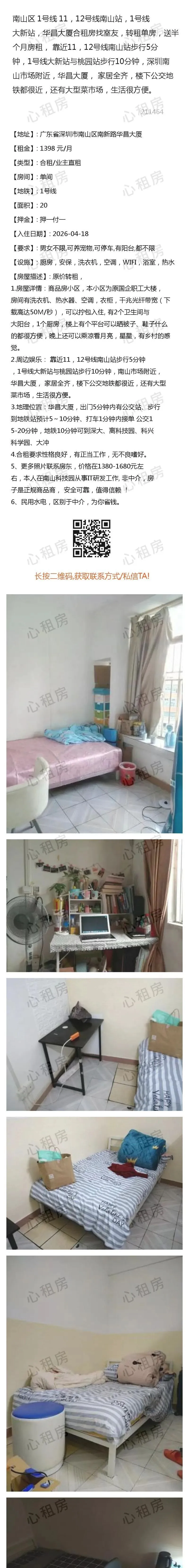 深圳租房>>南山区1号线11,12号线南山站,1号线大新站,华昌大厦合租房找室友,转租单房,送半个月房租, 靠近11,12号线南山站步行5分钟,1号线大新站与桃园站步行10分钟,深圳南山市场附近,华昌大厦, 家居全齐,楼下公交地铁都很近,还有大型菜市场,生活很方便。1398元/月