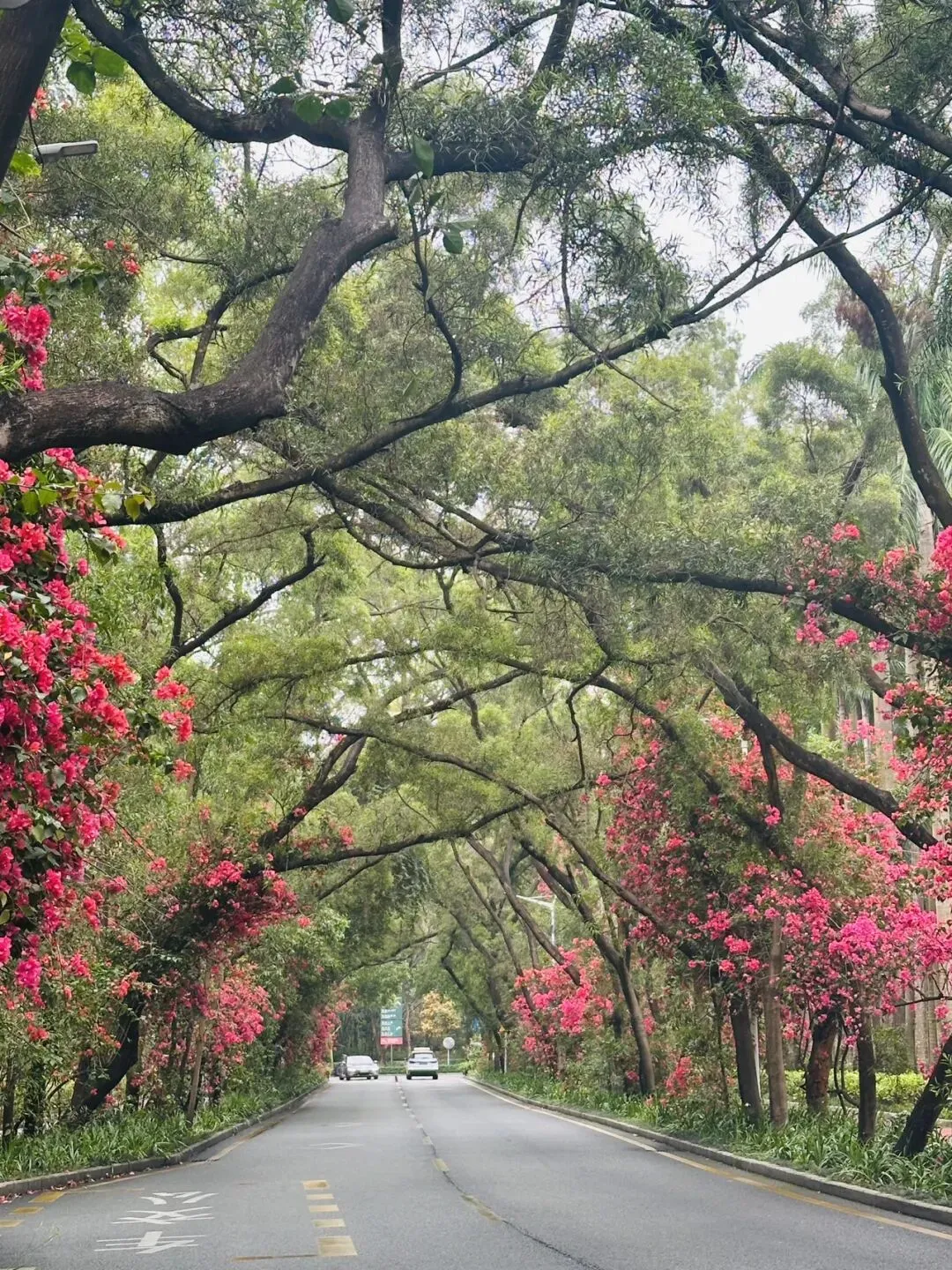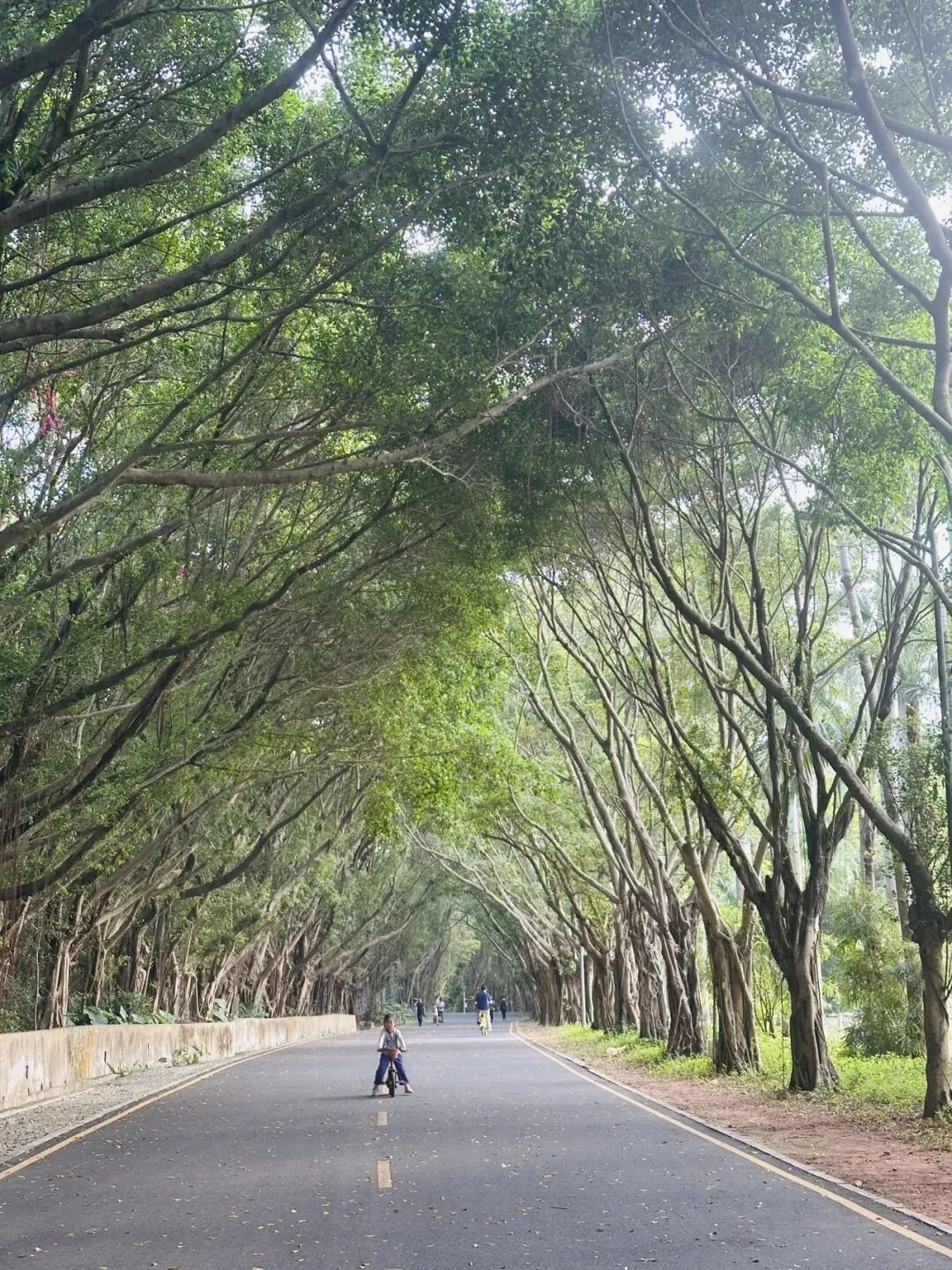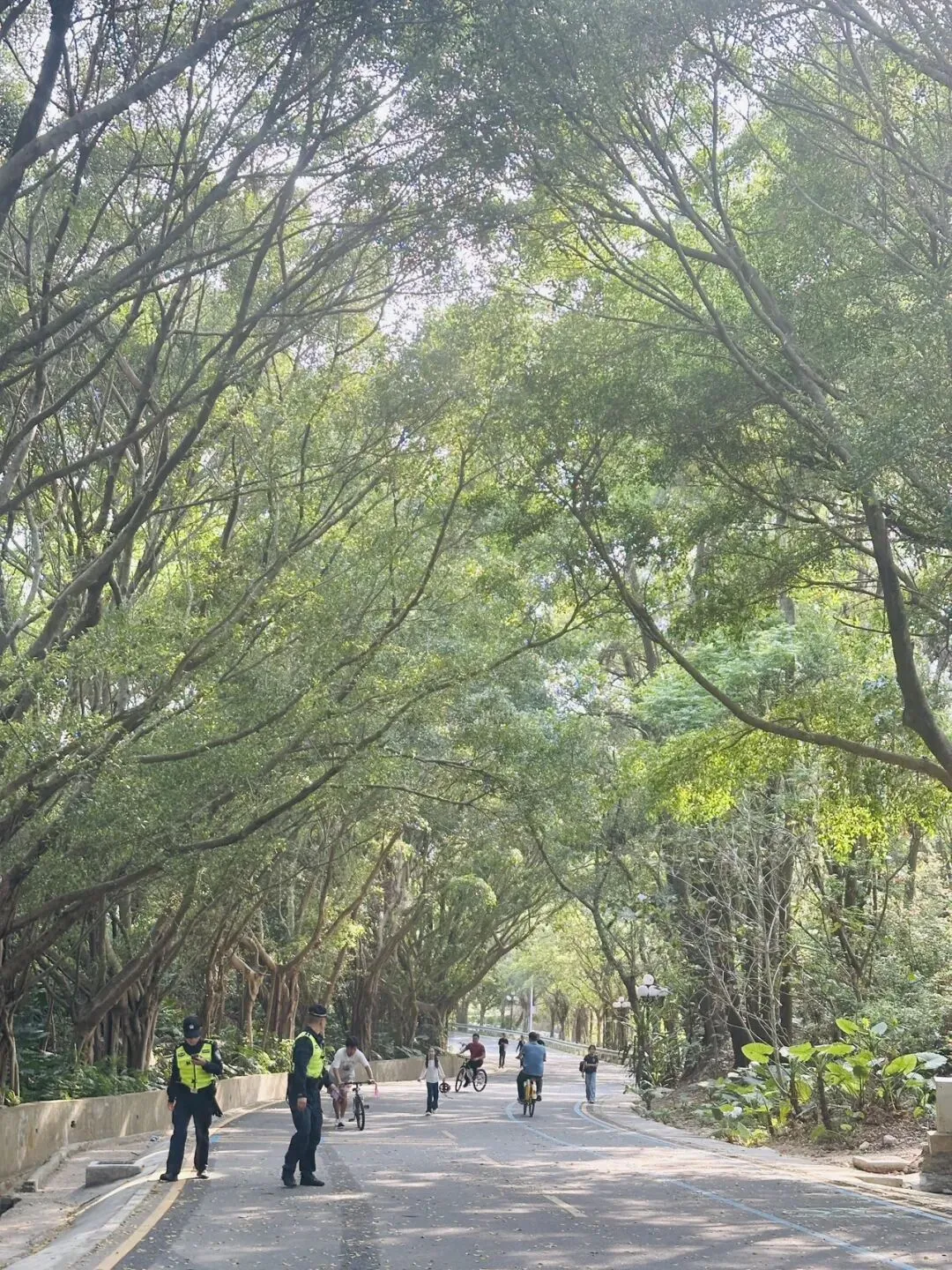 阳光透过树叶的缝隙洒下来,在地上印出斑驳的光影。因为是内部道路,整条路非常安静,只有风吹树叶的沙沙声和鸟叫声。这种被大自然包裹的感觉,真的可以完全超越华侨城香山中街(毕竟那里人多车多)。