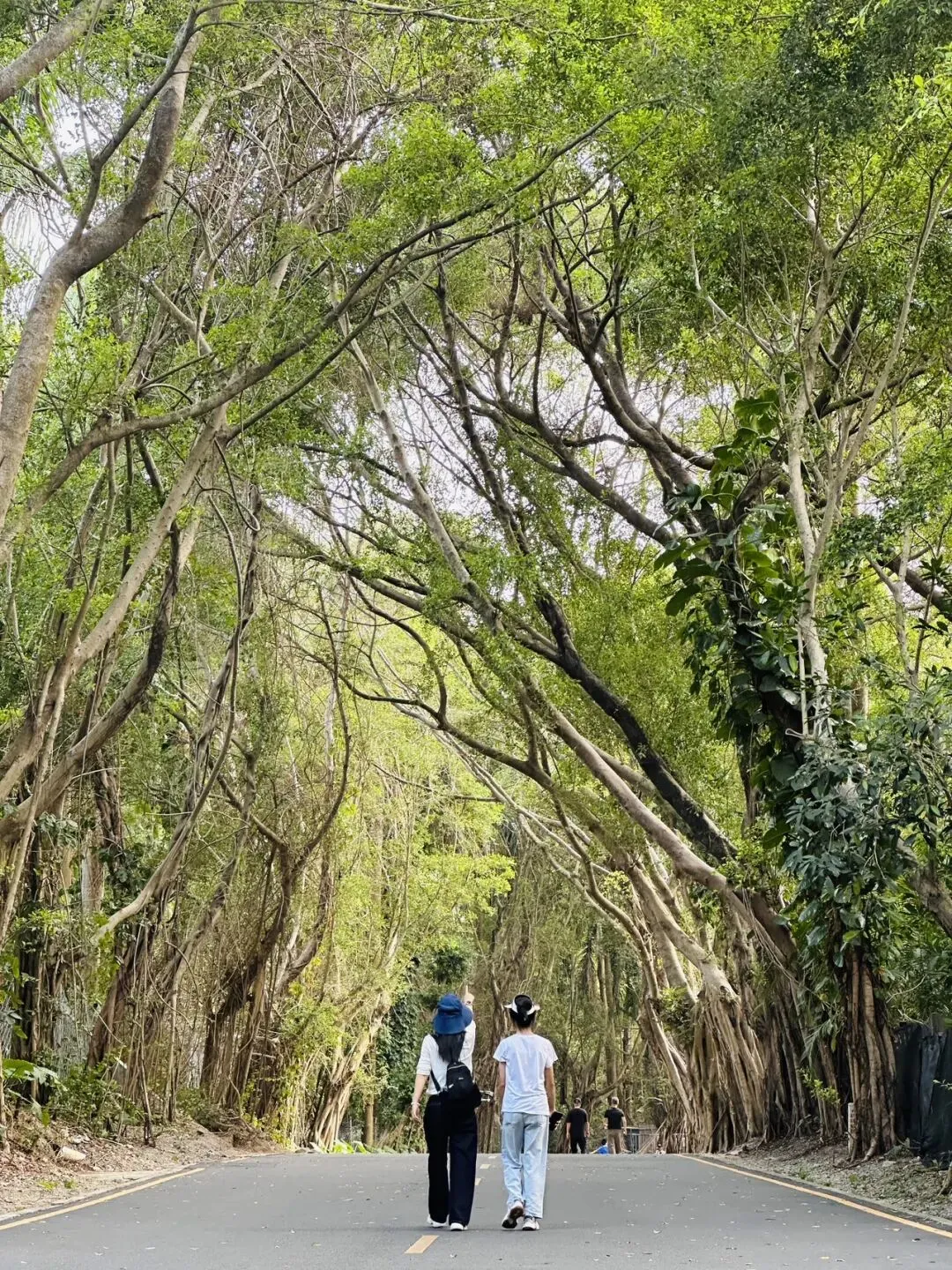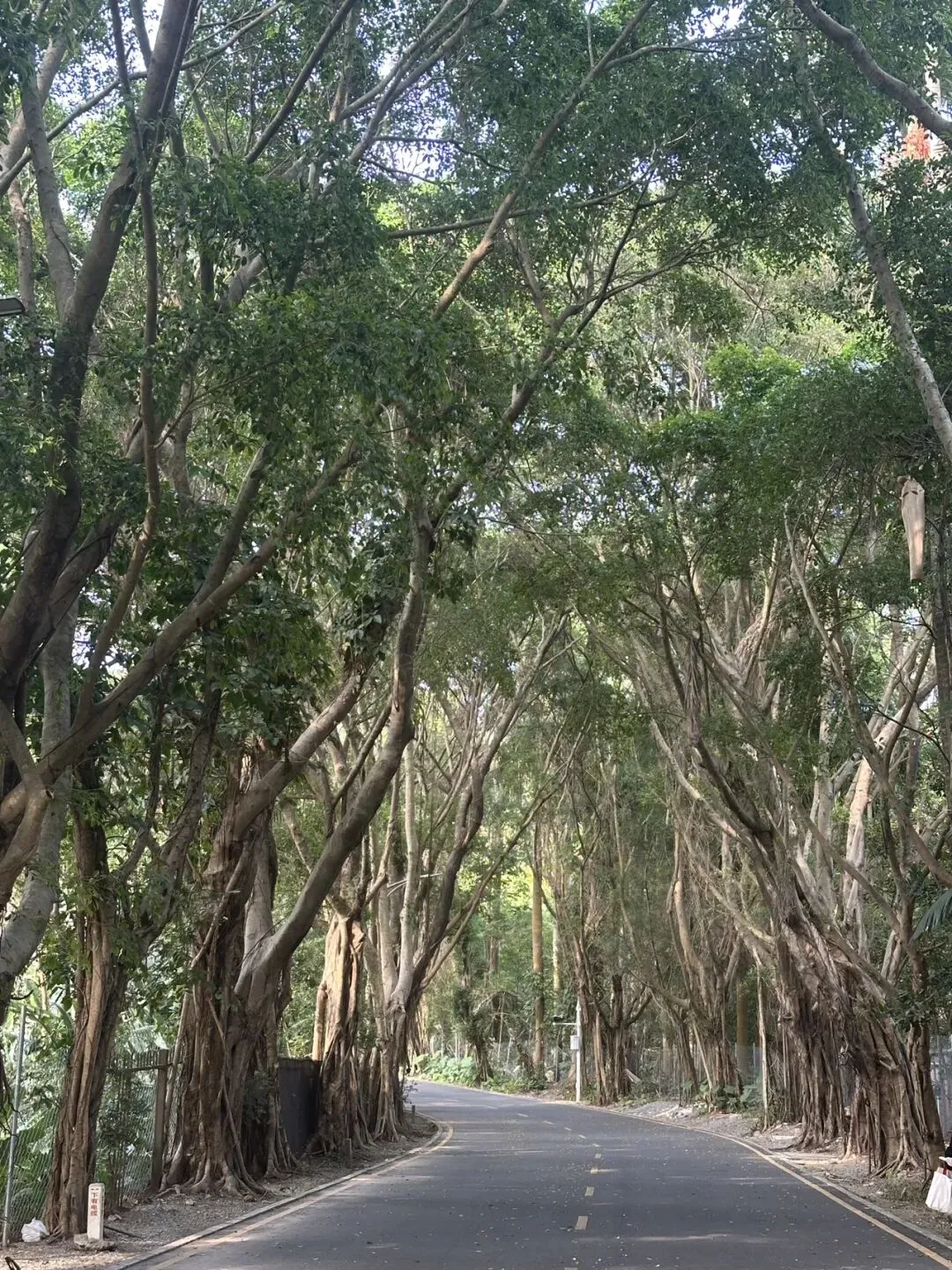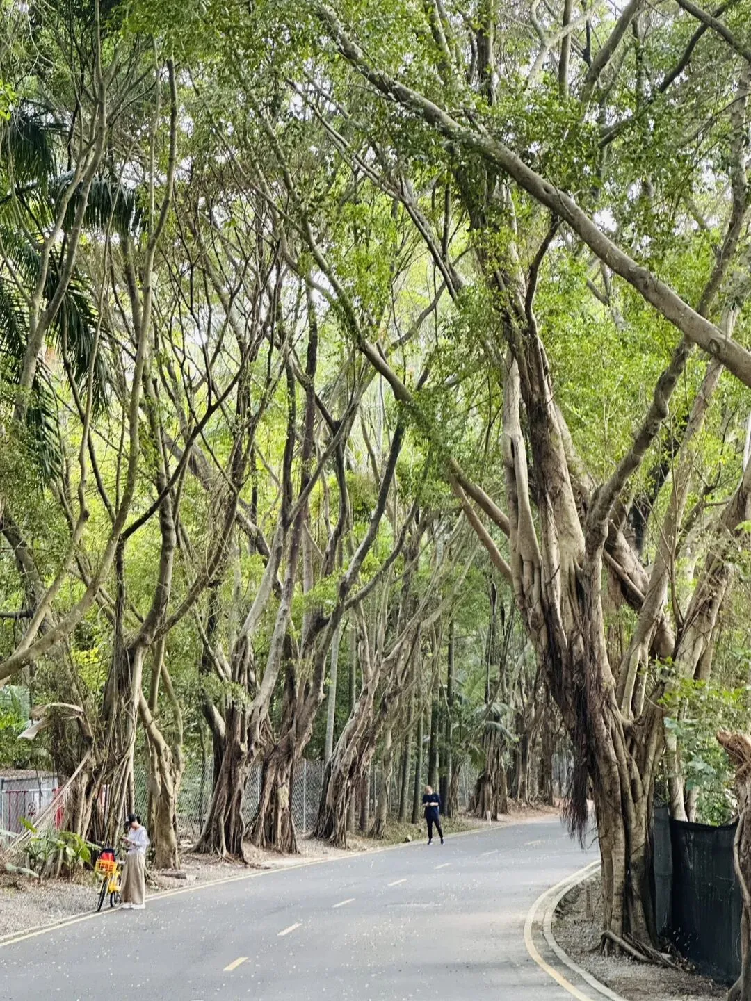 从东湖公园4号门进来,往罗湖区政务办公厅的方向走,你会发现一条很宽的马路。关键点是:这里没有车!也没有中间的隔离带! 只有两排上了年纪的大榕树,它们的枝叶在高处天然地交叉缠绕在一起,形成了一条望不到头的绿色隧道。
