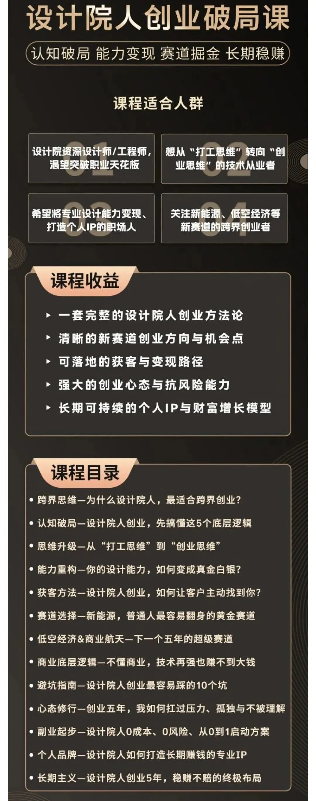 设计院人如何转型,如何破局,本台联合跨界新能源推出设计师转型系列课程,由跨界新能源朱总亲自授课,欢迎广大设计从业者试听。订购课程者即可获得金牌导师专属辅导机会,朱总亲自辅导答疑解惑,手把手带领设计师打破行业困局,创业破局。
