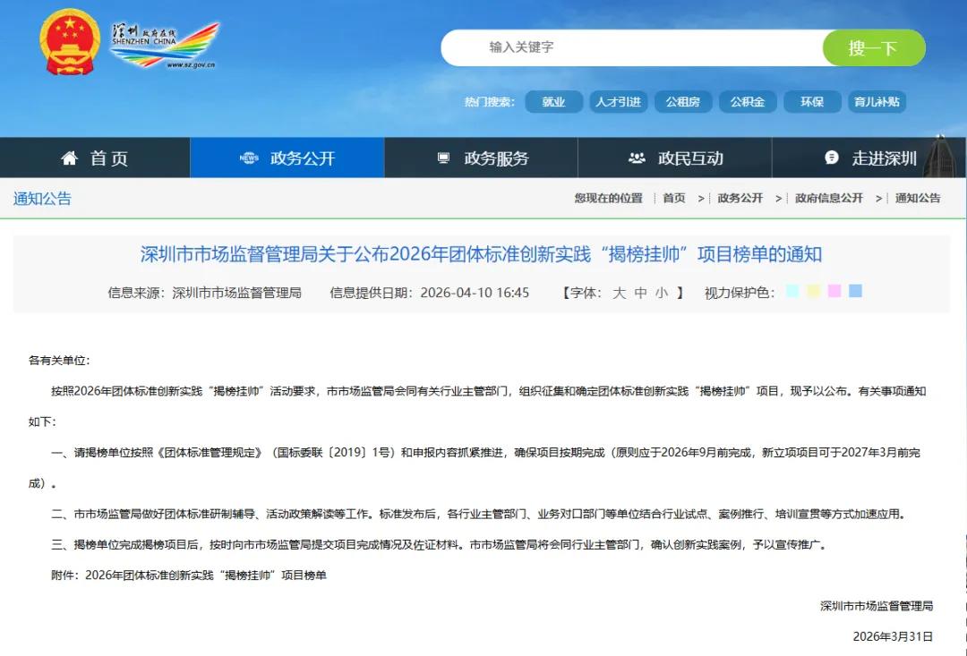 2026年4月10日,深圳市市场监督管理局正式发布深圳市2026年团体标准创新实践“揭榜挂帅”项目榜单。经广泛征集与严格评审,共有68个团体标准项目脱颖而出,涵盖新质生产力、可持续发展、城市治理、民生幸福、品质消费五大重点领域。