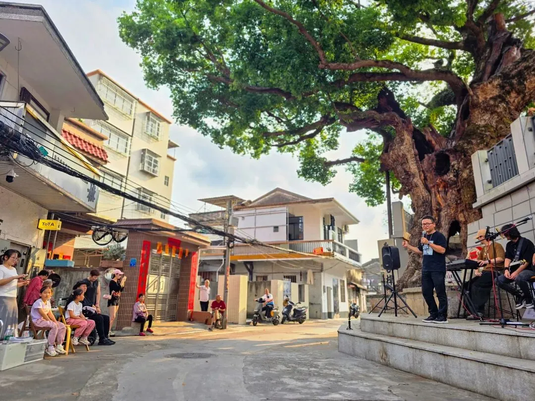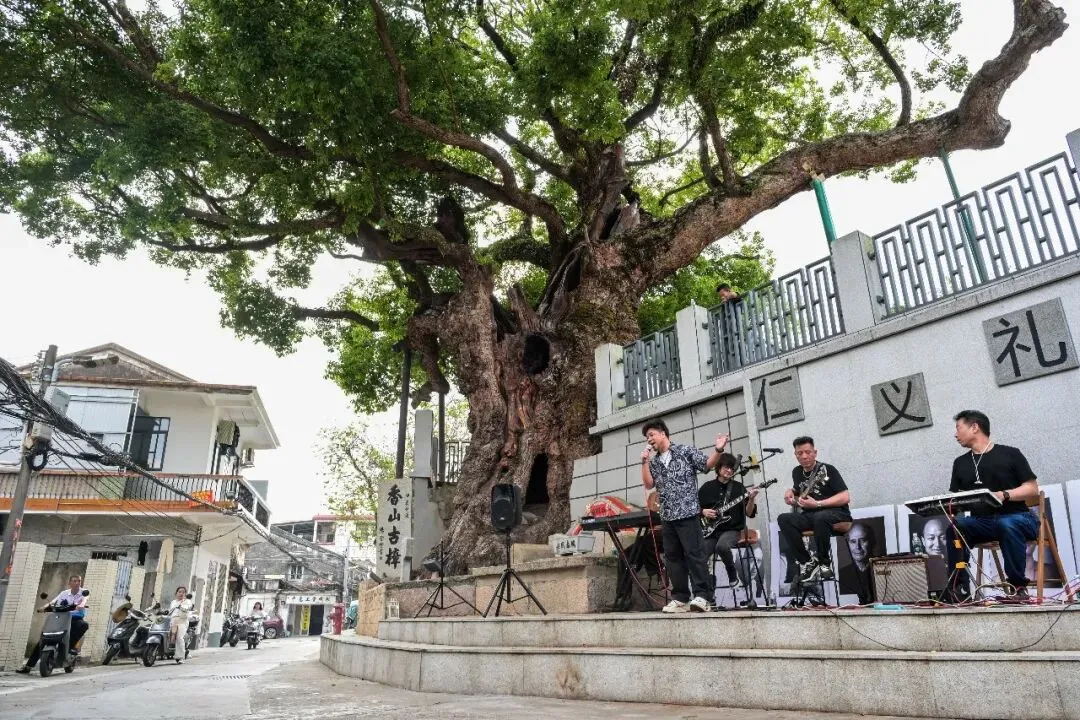 古樟树下,“古树新声” 小鳌溪乡村音乐季开唱。 一切缘起于小鳌溪村的古樟树。被网友们称为“香山第一樟”的它,是中山市目前登记在册的最古老的一棵树——根据2022年中山市自然资源局的鉴定,它当时的树龄约为830年。也是在这一年,深圳设计师陶文俊终于在大树对面,租下一座小楼,作为自己的工作室,以便自己一抬头便能望见大树。就像一句歌词所唱“只是因为在人群中多看了你一眼,再也未能忘掉你容颜”,2018年,来中山游玩闲逛的陶文俊对它一见钟情,以至于次年索性举家搬迁至中山。
