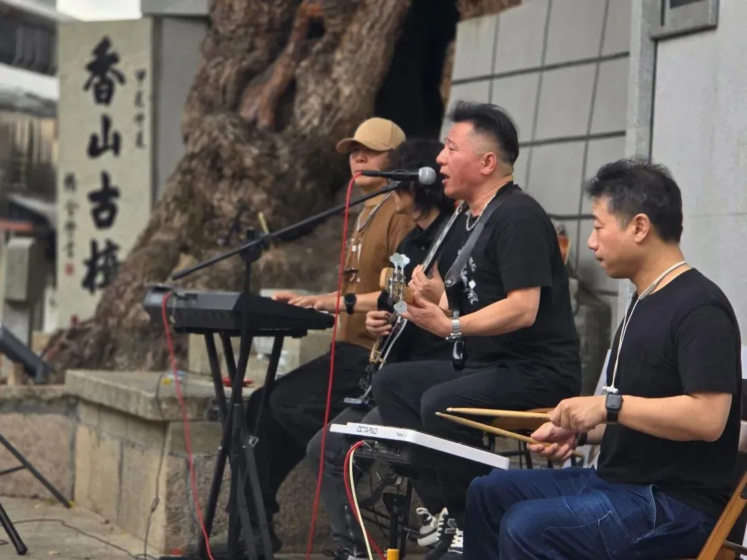 来自深圳的老牌摇滚乐队——电波乐队带来多首经典歌曲。为“小鳌溪乡村音乐季”作开场演出的,是来自深圳的老牌摇滚乐队——电波乐队,今年是乐队成立26周年。陶文俊与乐队成员也有着二十多年的交情。演出前夕,老朋友们相聚古樟树下,促膝谈天。凌晨时分,酒酣之际,灵感闪现,“我们即兴写下一首歌,叫《给陶文俊》,作为礼物送给他。” 主唱之一的曹园告诉记者。这首歌讲述的,也是陶文俊的经历与心声,讲述着他与古樟树的羁绊: