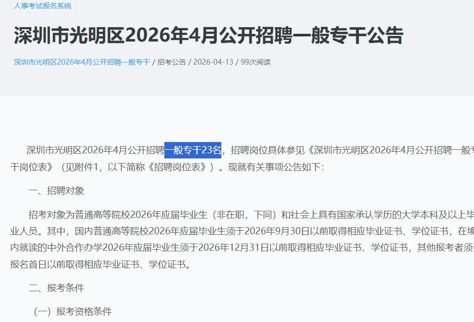 深圳市光明区2026年4月公开招聘一般专干23名,招聘岗位具体参见《深圳市光明区2026年4月公开招聘一般专干岗位表》(见附件1,以下简称《招聘岗位表》)。现就有关事项公告如下: