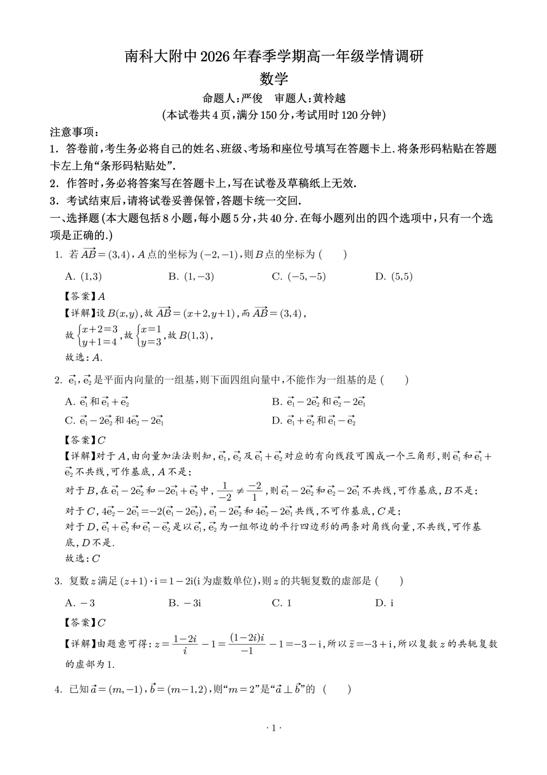 作者寄语:深圳南方科技大学附属中学2025-2026学年下学期高一学情调研数学试题+答案,7天有效领取,手慢无!!!