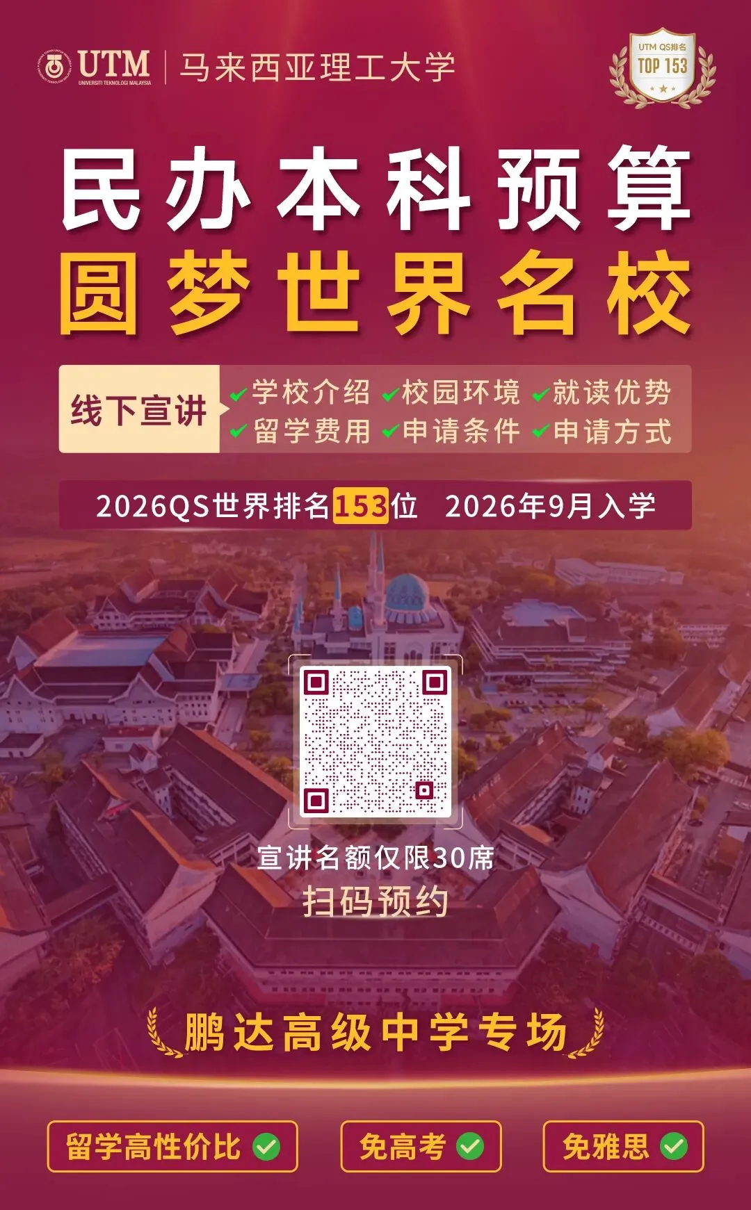 与此同时,UTM中国项目中心正式授权鹏达高级中学设立“高中预科中心”。我校将按照UTM给出的预科课程体系,开设英语强化、基础科学、数学及计算机科学等过渡性课程,帮助学生适应大学学习环境,为赴马来西亚深造做好充分准备。UTM预科课程通常为1至2个学期,申请需高中或同等学历,完成预科并通过考核后,学生可直接进入UTM本科学习。