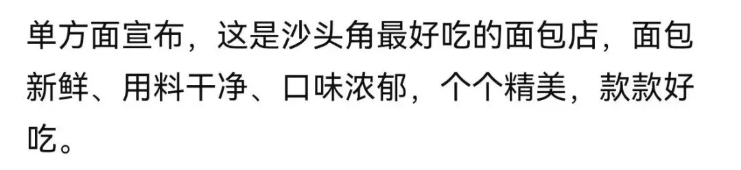 大众点评显示,该店铺的人均价格为25元。不少网友表示:“面包、方包都好吃,豆浆也挺不错的”“柠檬泡芙奶油确实很清新,甚至有小时候吃过的味道”。甚至有网友评论称:“单方面宣布,这是沙头角最好吃的面包店”。