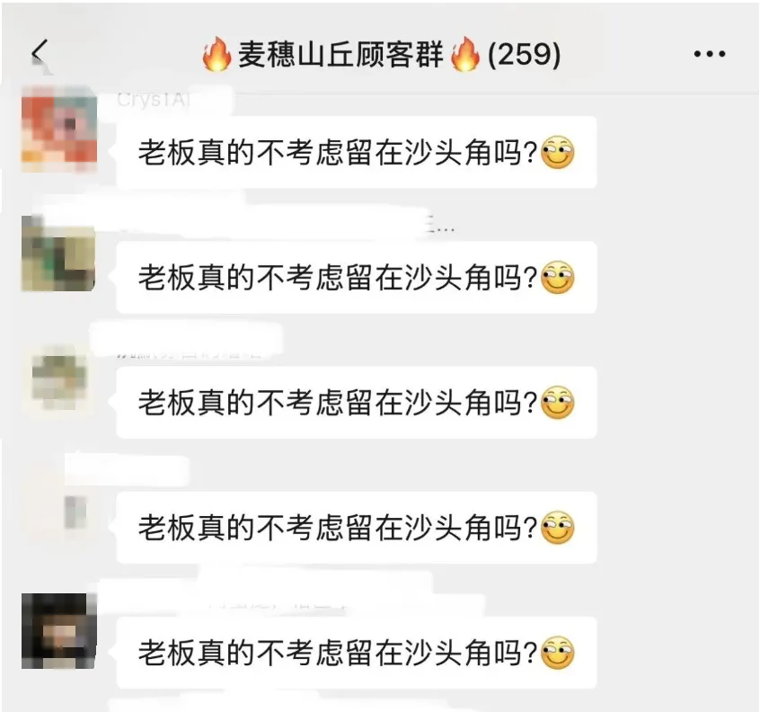 在麦穗山丘顾客群,顾客们齐刷刷地挽留:“老板真的不考虑留在沙头角吗”?