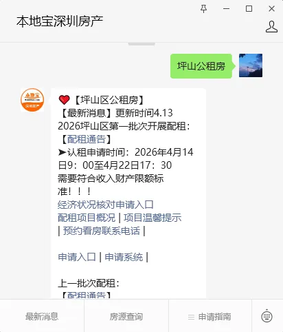 点击下方你关注【本地宝深圳房产】公众号,输入【坪山公租房】关键词,即可获取坪山区公租房配租公告、配租项目明细、申请入口、项目温馨提示等信息