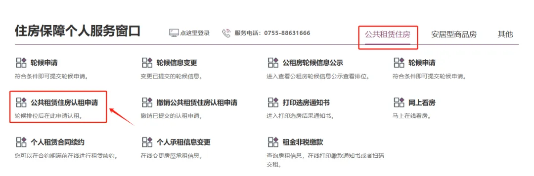 ⭕在【住房保障服务】页面下方找到【住房保障个人服务窗口】点击【公共租赁住房认租申请】