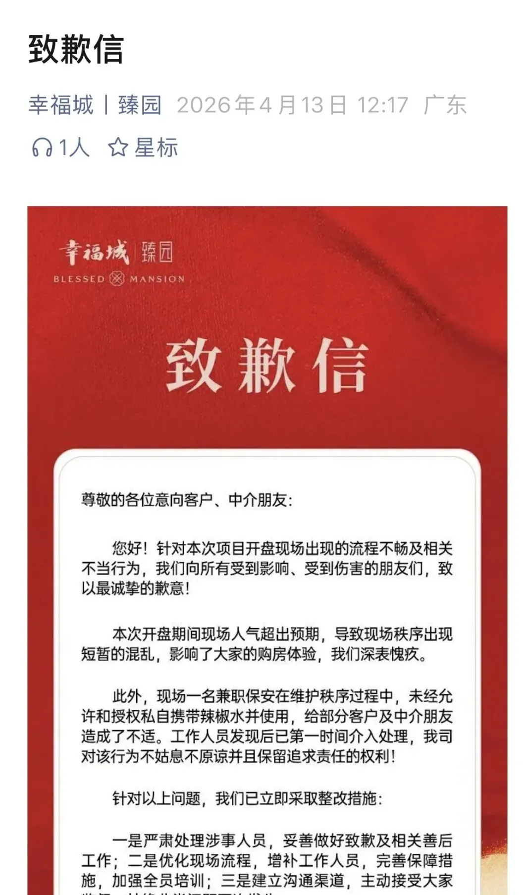 4月13日中午12时许,开发商深圳市鸿耀泰实业有限公司在其官方微信公众号发布致歉信,对所有受到事件影响的客户和中介朋友致以最诚挚的歉意。致歉信称,现场人气超出预期导致秩序混乱,涉事保安为兼职人员,其行为未经公司允许和授权。开发商表示,已严肃处理涉事人员,并将优化现场流程、增补工作人员、加强全员培训,杜绝此类事件再次发生。