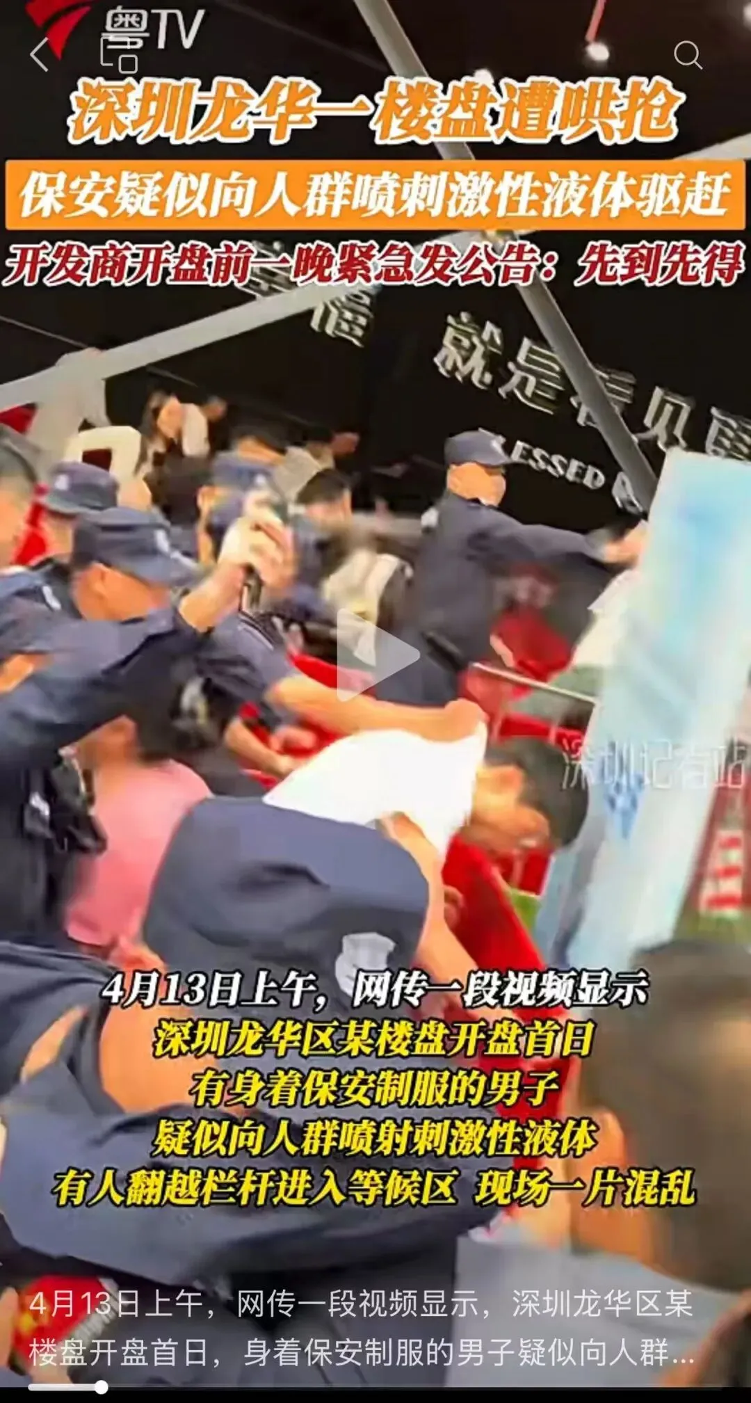 千人抢房、保安喷辣椒水、选房靠“肉搏”……这不是电影,而是2026年4月13日深圳龙华区一个真实的开盘现场。昨天上午,深圳龙华区“幸福城·臻园”项目开盘。因为价格大幅下调,现场涌入上千名购房者,一度秩序失控。混乱中,一名兼职保安竟向人群喷洒辣椒水,导致多人眼部不适、现场恐慌。事件迅速冲上热搜。人们震惊于“开盘喷辣椒水”的荒诞,更困惑于:深圳的楼市,到底怎么了?