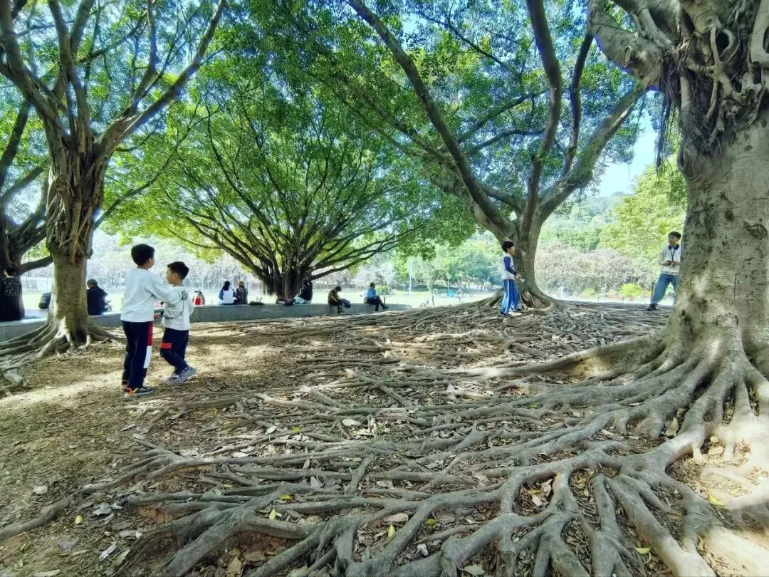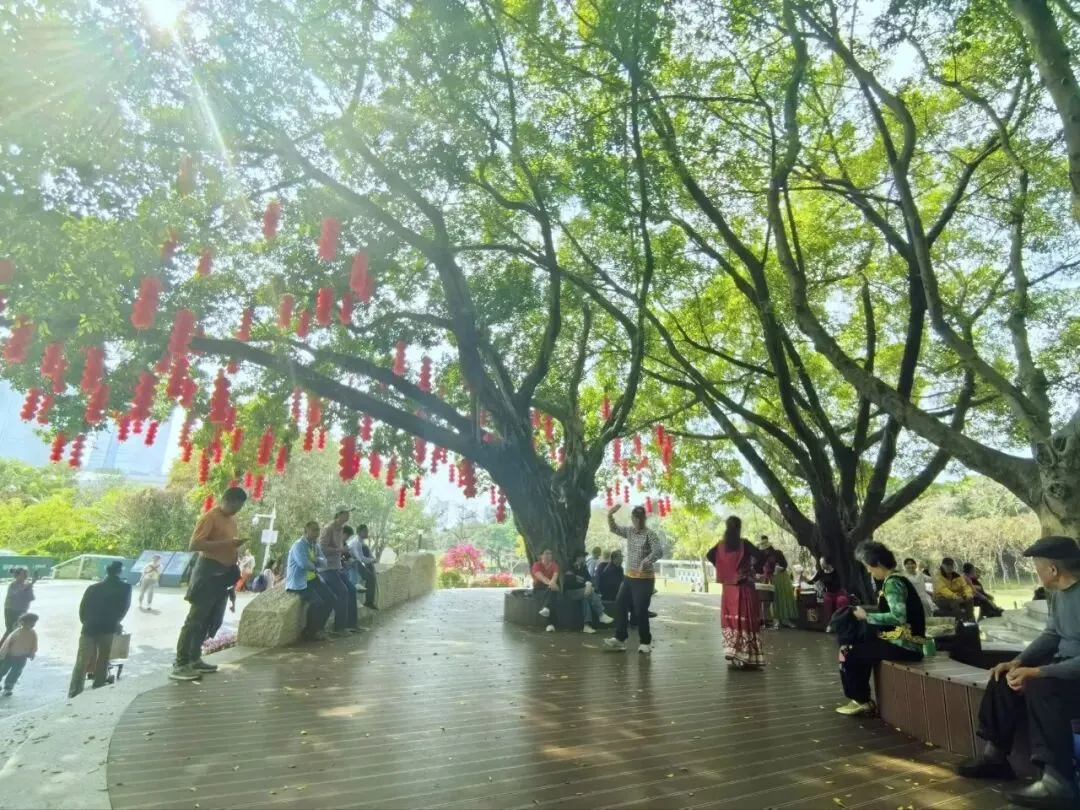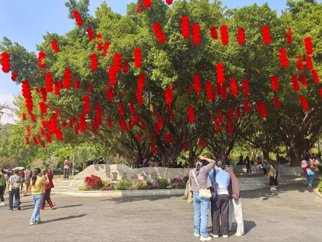 走廊尽头,公园入口处几棵粗壮古老的大榕树盛装迎客,一串串喜气洋洋的红灯笼从繁茂向阳的绿叶中垂挂下来,随风招摇,榕树苍劲挺拔虬枝峥嵘,一座城市都在抒写着国泰民安的光阴。