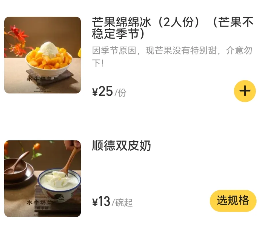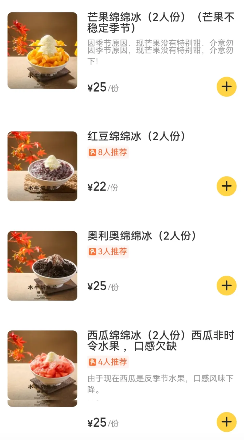 在保障高“质”的前提下,水牛奶皇后的定价却显得“便宜大碗”。芒果绵绵冰25元,双皮奶13元,红豆沙甚至不到10元。这并不是简单的低价竞争,而是在交易费用约束下,实现了合理溢价的“超值感”。