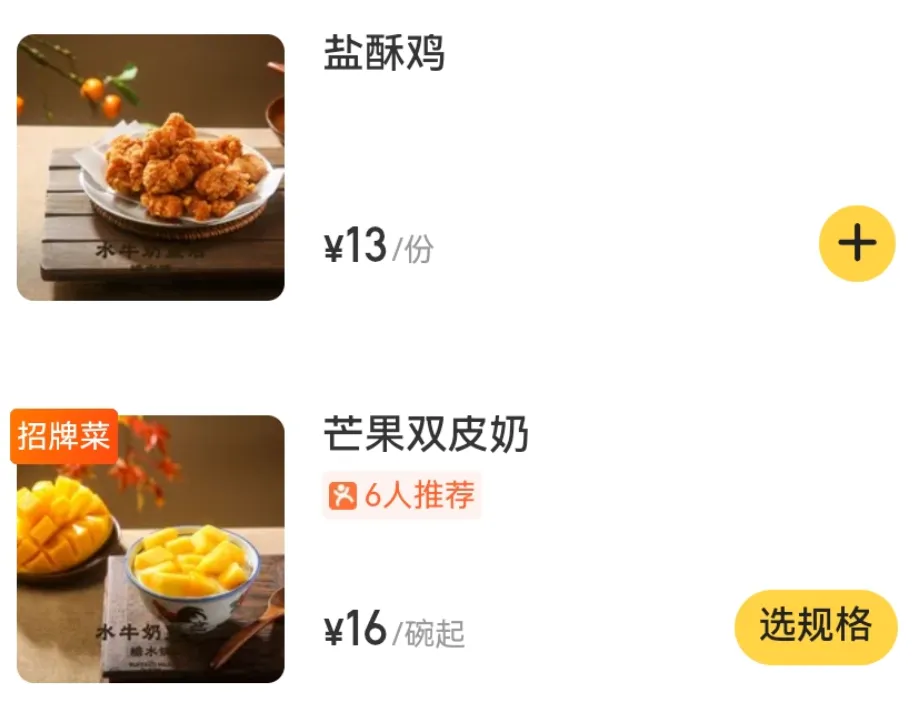2.有何不同?特性——比普通奶更醇、更香、更厚。每日现挤供应,双皮奶要蒸6小时,豆花要熬10小时。还有炸鸡这些咸的小吃。