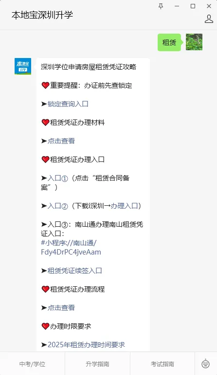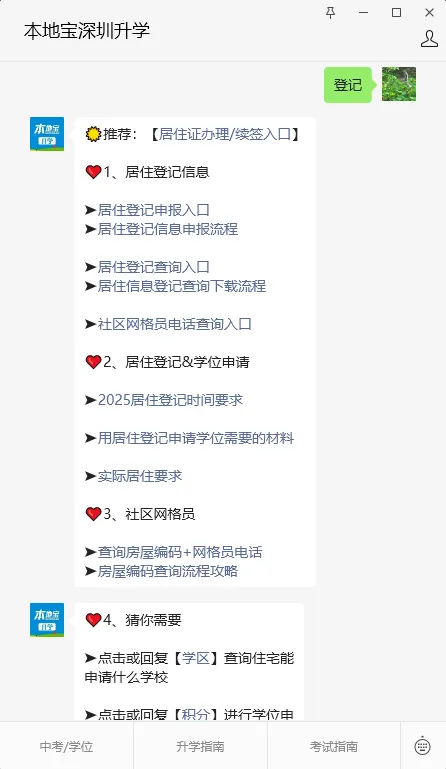 在“深圳公安”/“深圳市住房和建设局”公众号,或者长按下方二维码,进入【本地宝深圳升学】回复【登记】/【租赁】获取居住登记/租赁凭证办理入口、办理流程、办理材料等
