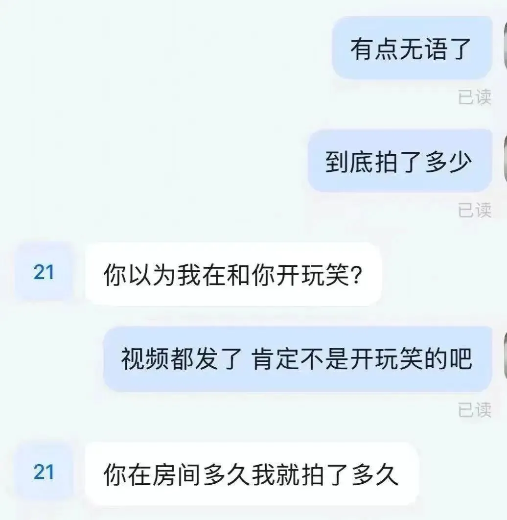 刘先生提供的聊天记录显示,对方曾向其发送一段二人在酒店房间内的视频片段,并称“你在房间多久我就拍了多久”。