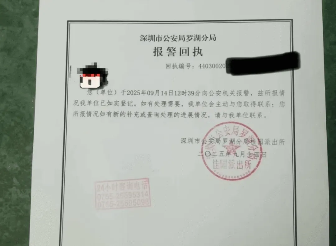 刘先生向记者提供的报警回执显示,其于9月14日向公安机关报警,落款为深圳市公安局罗湖分局桂园派出所。