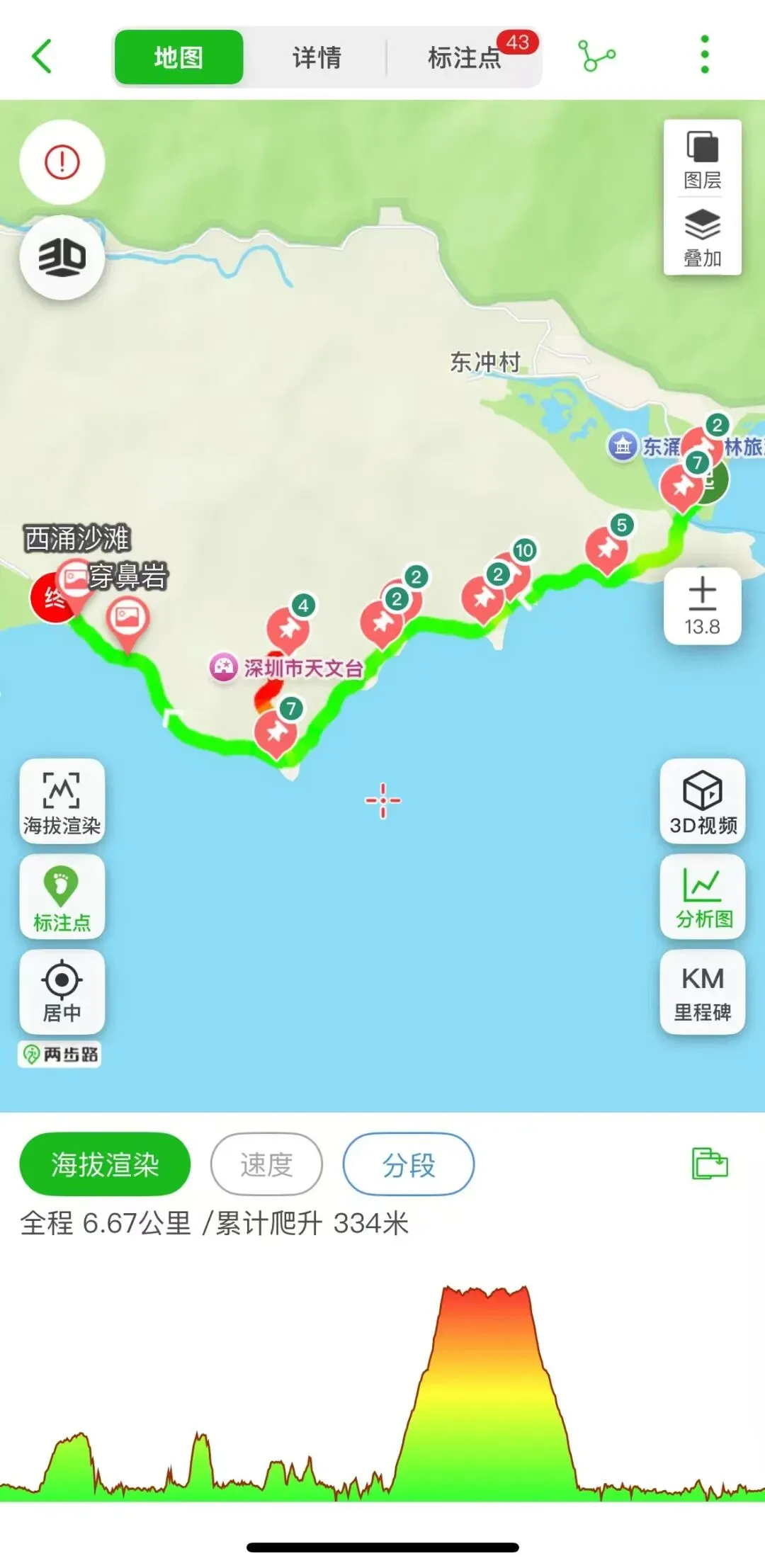 即从东涌沙滩出发,经大排头、穿鼻岩、深圳市天文台,再到西涌四号浴场,终到西涌穿鼻岩。