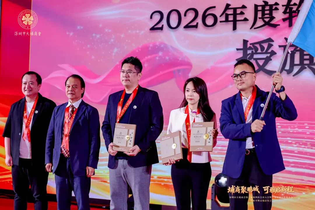 随后,创会会长兼理事长廖俊达、监事长彭琬茜、荣誉会长张俊鸿、赖厚康,以及新一届轮值会长徐奕发、邓文静、赖洲等核心成员依次登台接受授牌与授旗。