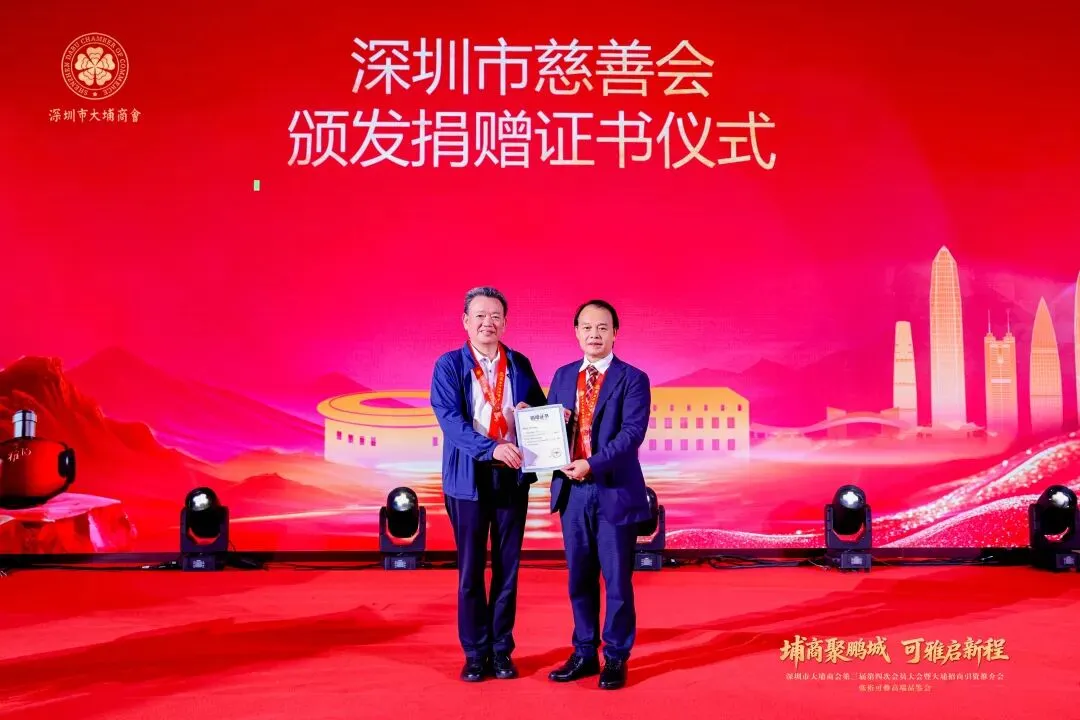 在慈善环节,深圳市慈善会副会长余惠强先生为深圳市大埔商会颁发了捐赠证书,表彰商会在公益慈善事业中的突出贡献。