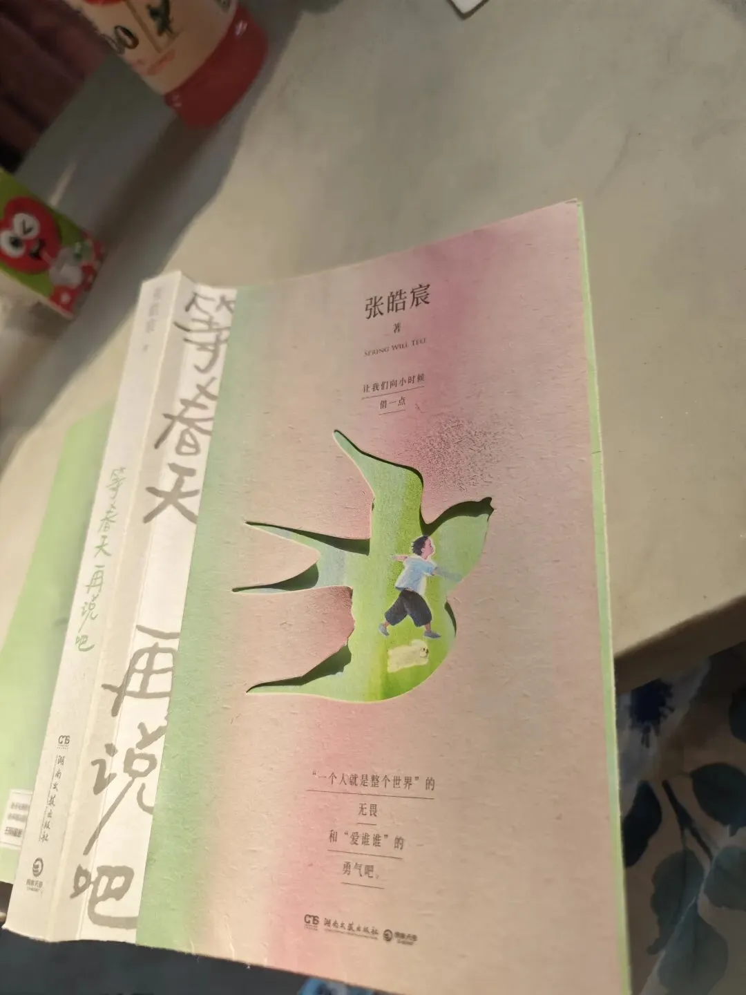 我选择了另一本书,这本书的名字叫做《等春天再说吧》我拿了这一本书,起因是因为他这本书的封皮!很童真,让我觉得这本书应该也充满了童真,看了大半本书,我觉得这个作者跟我很有共鸣,他说他看头脑特工队的时候,最感动的也是印象最深刻的是那是冰棒和乐乐一起唱小时候的童谣,让车子飞起来,可是车子终究载不下两个人的重量,于是冰棒跳下了车,乐乐一个人飞向了月球,冰棒是这个主人小时候的玩具!可是现在小主人的童真不在了,冰棒也就消失了,我一开始印象最深的也是这一段,去问了问好多人,好多人甚至都不记得这一段