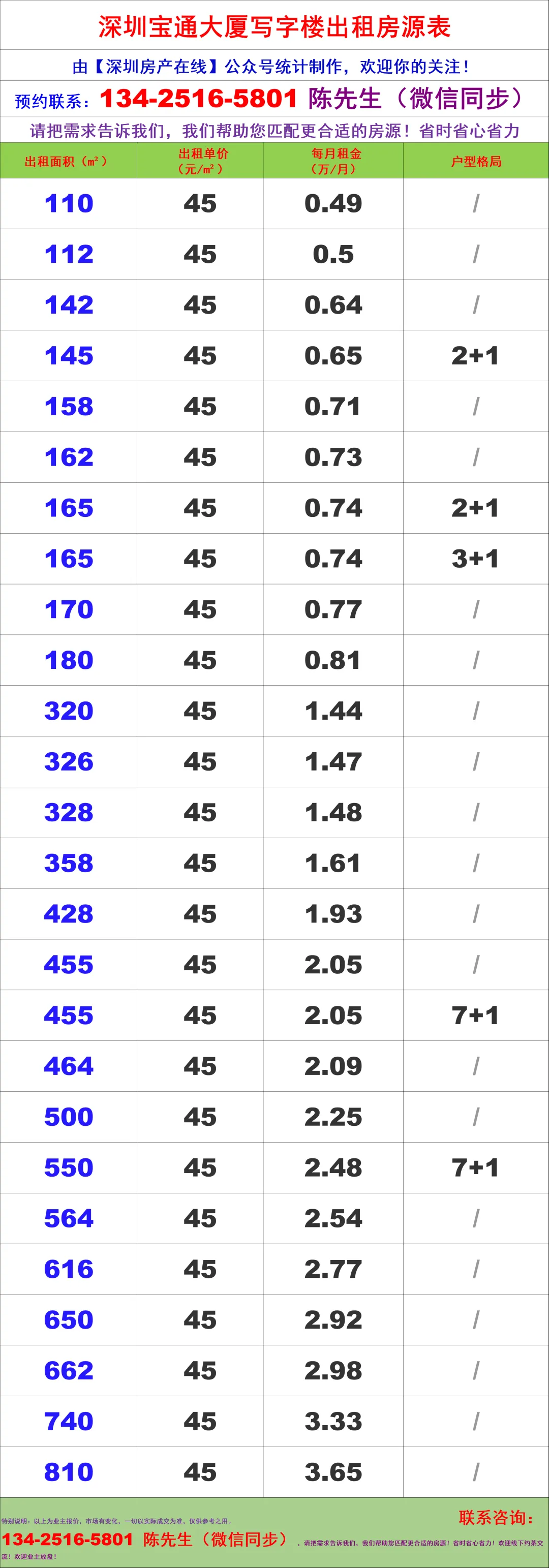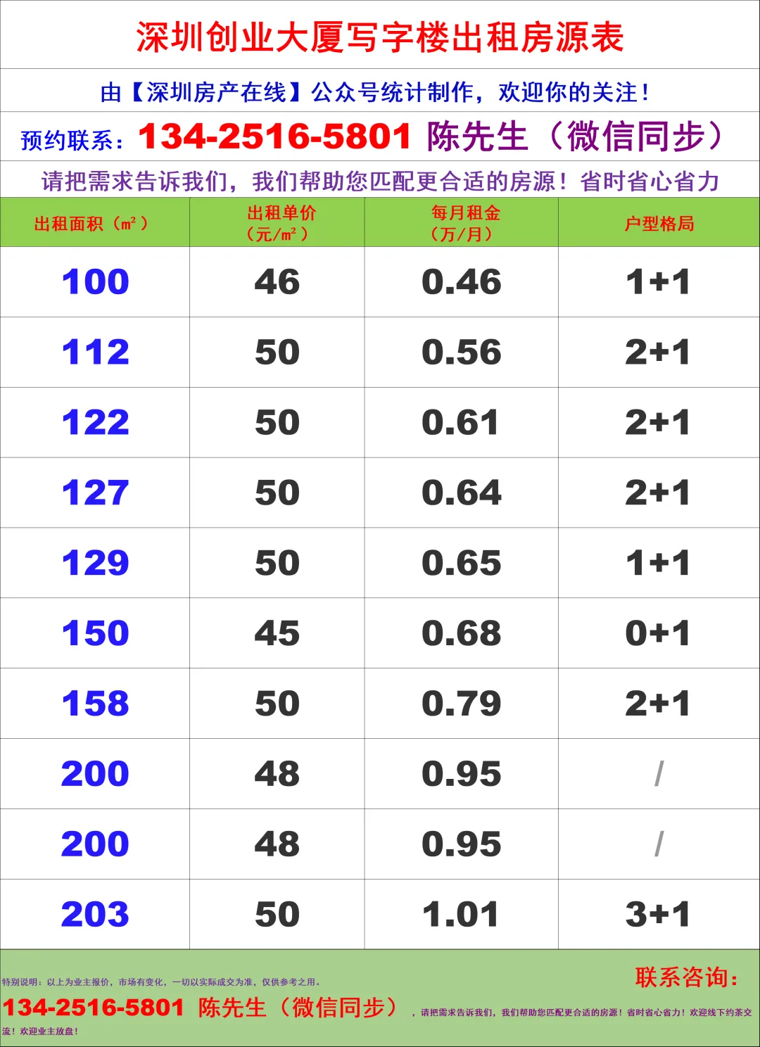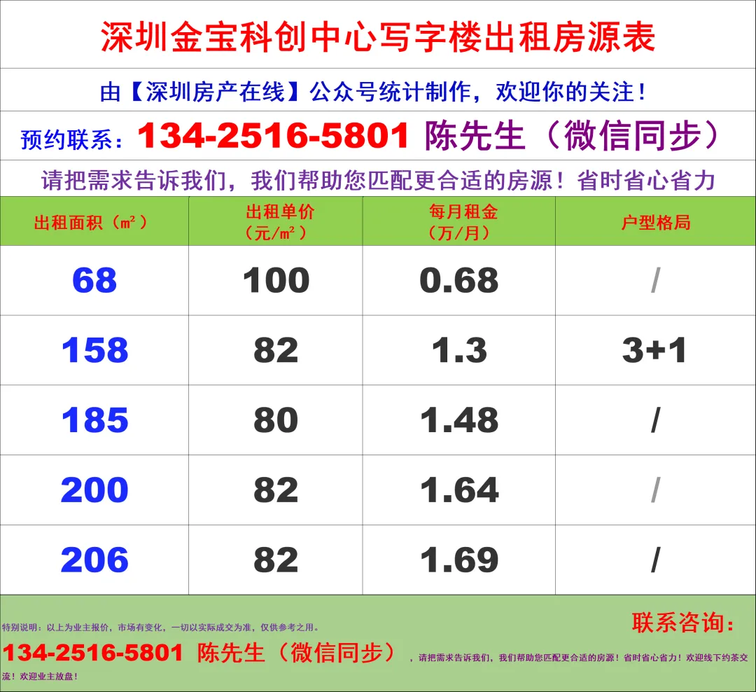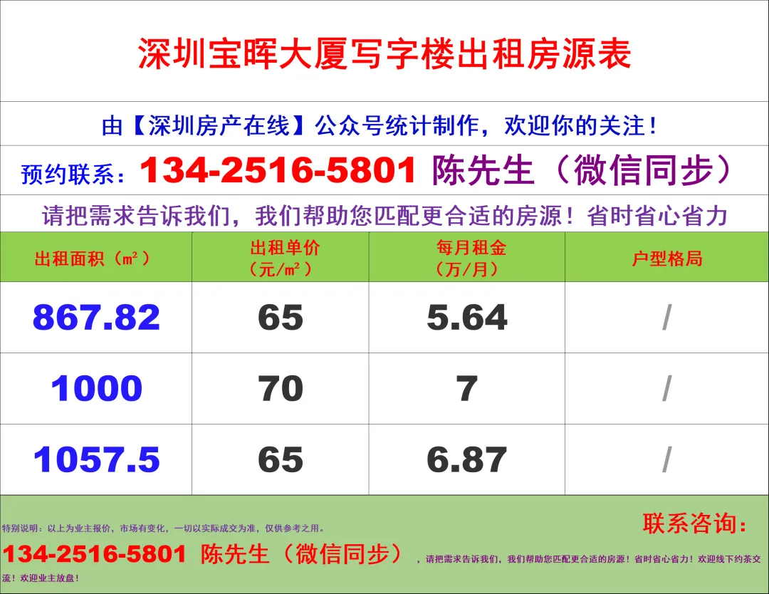 【深圳房产在线】陈经理写字楼租售团队:134-2516-5801 (微信同步)