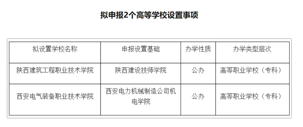 4月13日,陕西省教育厅发布关于拟申报2个高等学校设置事项的公示,拟申报新增陕西建筑工程职业技术学院和西安电气装备职业技术学院两所公办高等职业学校(专科层次),公示期自2026年4月13日至17日。公示!陕西拟新增2个高等学校