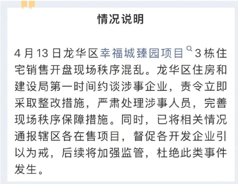 4月13日,深圳市龙华区“幸福城臻园”项目3栋住宅楼开盘销售,因价格大幅下调引发购房者高度关注,现场出现排队抢购情况。期间,秩序维护人员与排队人群发生冲突,有保安使用了辣椒水,导致场面一度混乱。事件发生后,项目开发商迅速发布致歉声明。同日,龙华区住房和建设局第一时间约谈涉事企业,责令立即采取整改措施,严肃处理涉事人员,完善现场秩序保障措施。