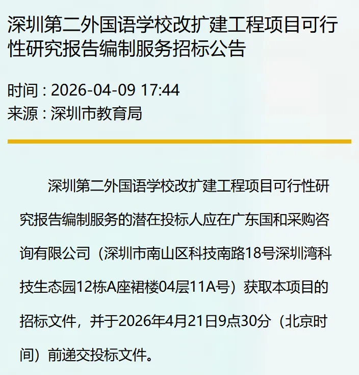 4月9日,深圳市教育局官网发布《深圳第二外国语学校改扩建工程项目可行性研究报告编制服务招标公告》。