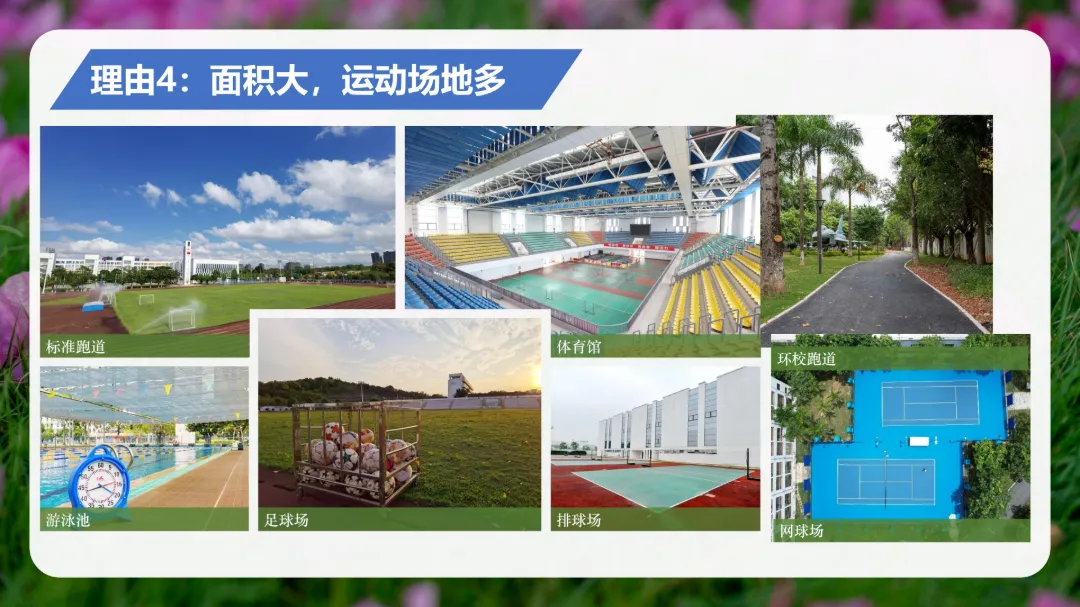 学校占地面积11.9万平米,有充足的活动空间。校园建筑气势恢弘,教学区、生活区、运动区布局合理。图书馆大楼建筑面积达7000平米,藏书丰富。田径场、游泳池、健身房、篮球场、排球场、足球场、网球场、羽毛球馆、乒乓球馆一应俱全。