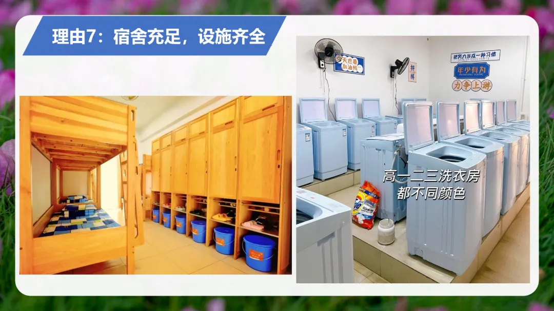 春华苑、夏锦苑、秋实苑三栋学生宿舍楼。6人/间,上下铺。全实木上下床,宿舍配备实木家具、空调、独卫、阳台等;每层楼设有公共浴室;生活区设有洗衣房、烘干机、饮水机、医务室、生活服务中心,心理教师、生活教师、校医、保安24小时值班。