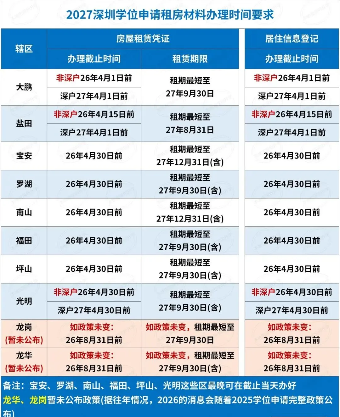在往年,龙华龙岗的租赁凭证/居住登记办理截止时间是最晚的,都是学位申请前一年的8月31日前办理好就行