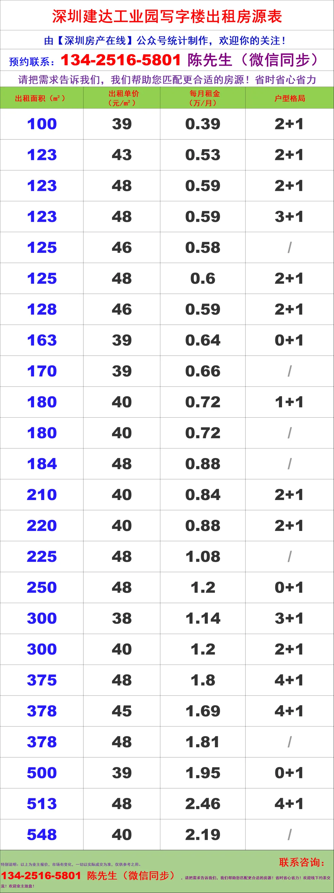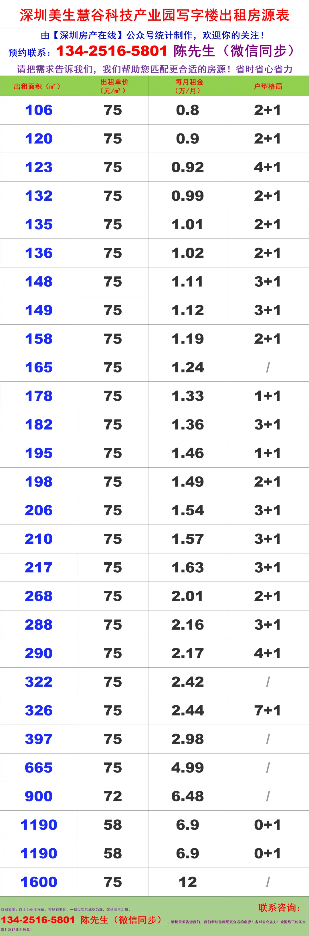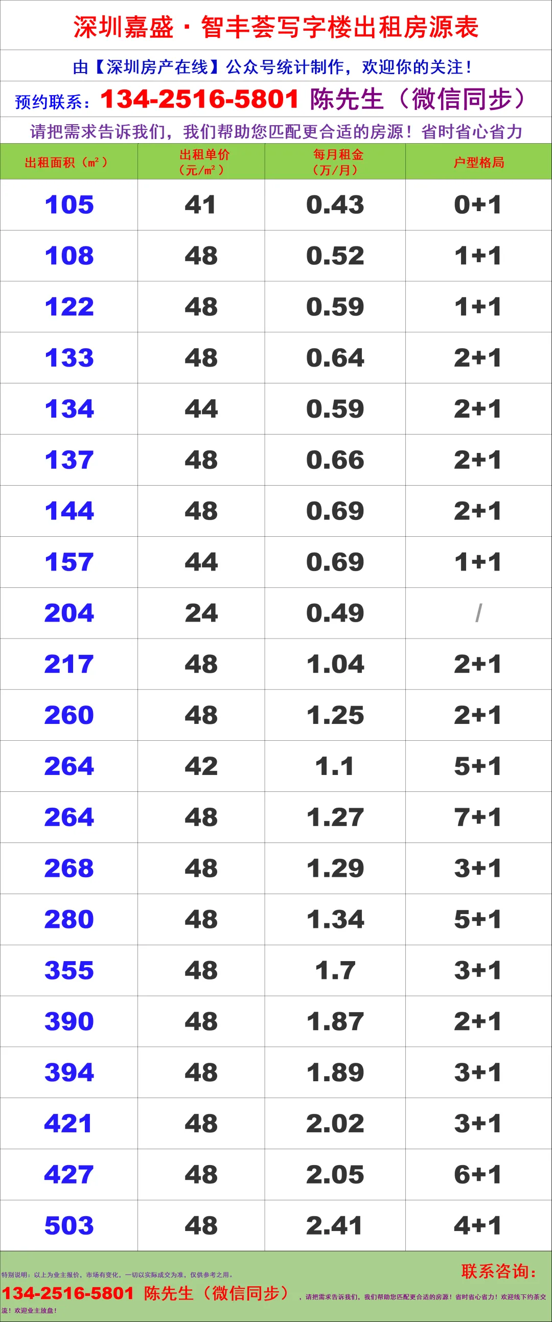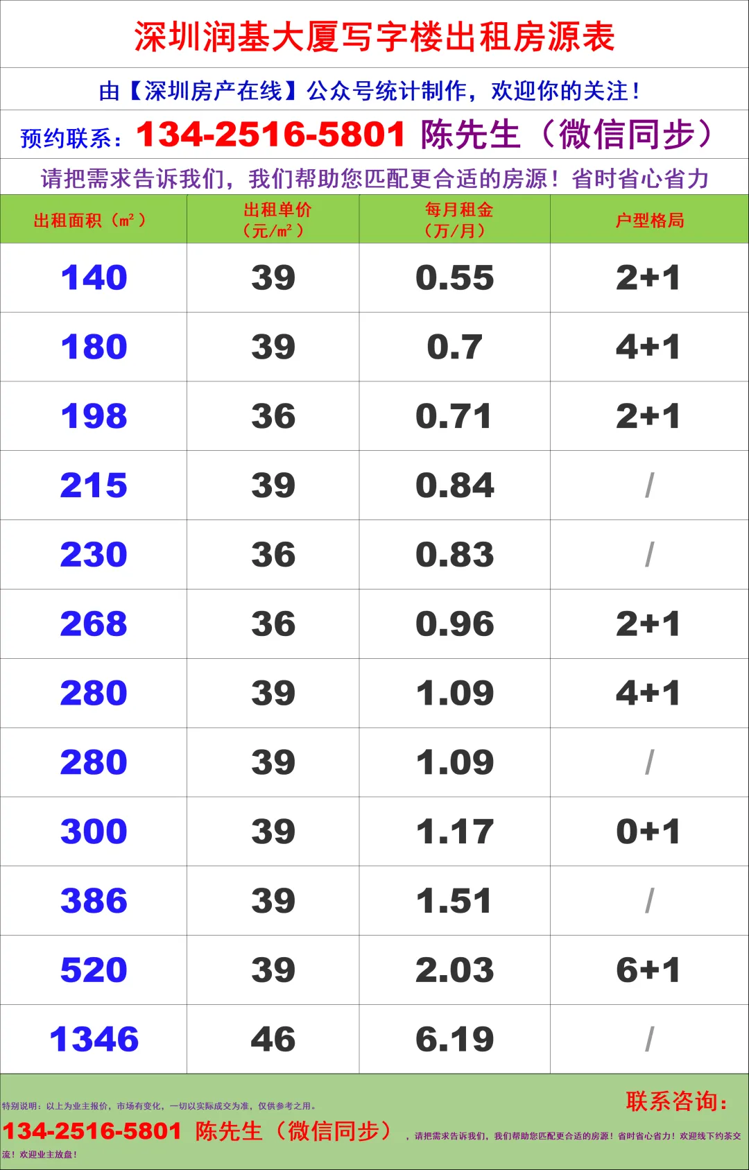 【深圳房产在线】陈经理写字楼租售团队:134-2516-5801 (微信同步)