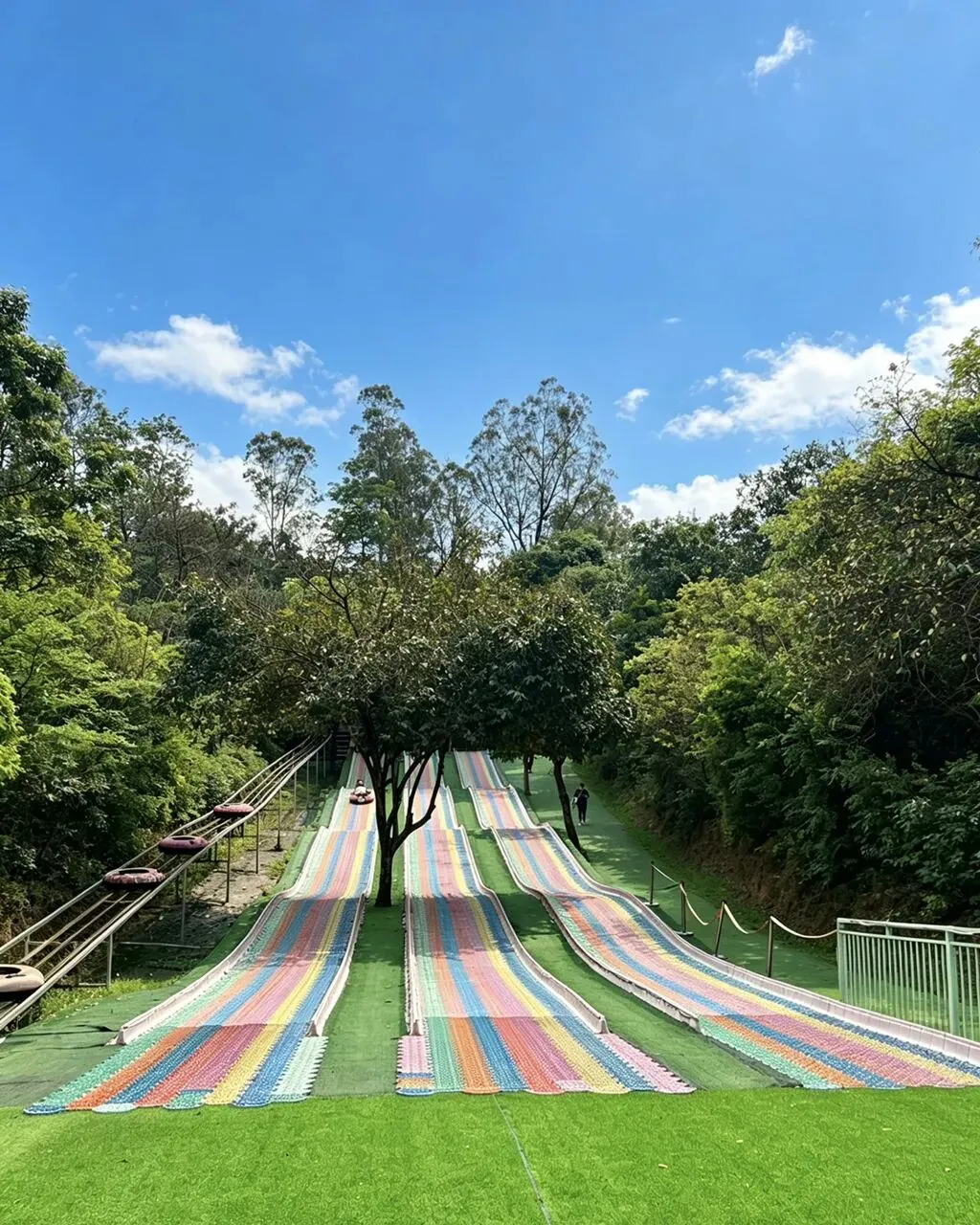 七彩滑道颜值高,拍照确实出片,但坡度比预期平缓,刺激感一般,适合 5 岁以上娃。可单人或双人滑,收费 25 元 / 次,无需排队太久,套票是包括在里面的